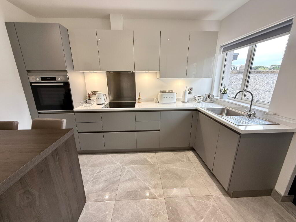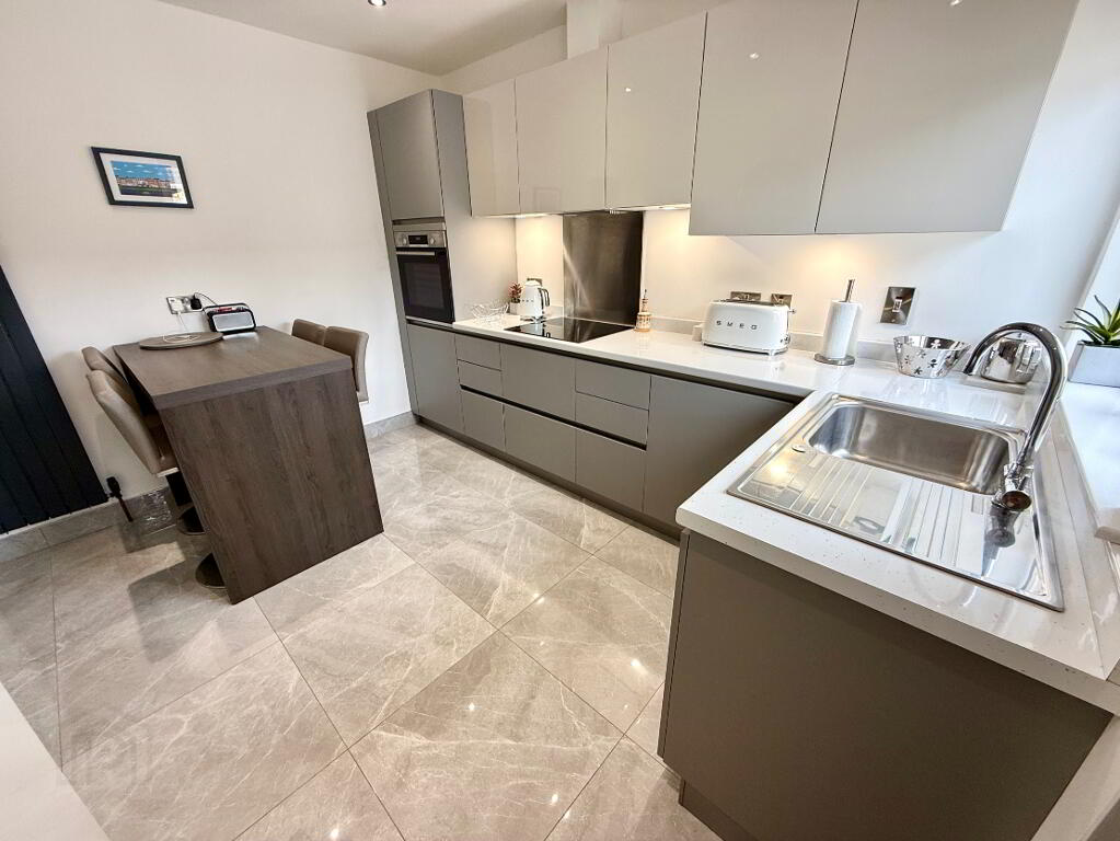 Kitchen/Dining 11'5 x 10'4 Kitchen by Poplar Design, eye and low level unit, single drainer stainless steel sink unit with mixer tap, hob, oven and extractor fan, integrated fridge/freezer, integrated washing machine, tiled floor, breakfast bar, recessed lighting.