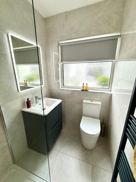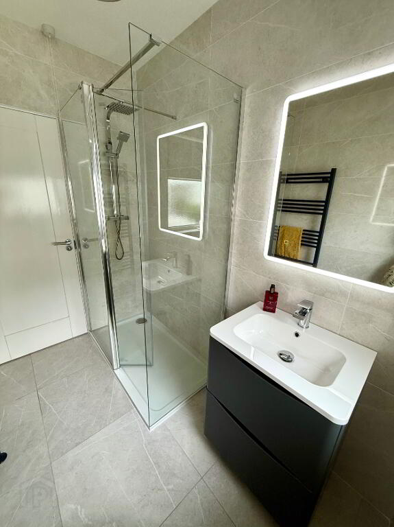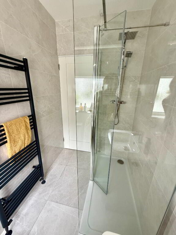 Main Shower Room Fully tiled walk in rain shower, wash hand basin set in vanity unit, WC, fully tiled walls, tiled floor, heated towel rail.
