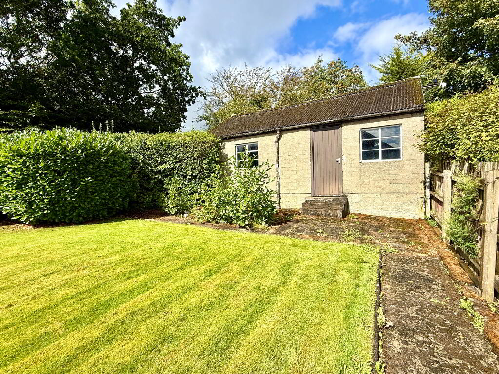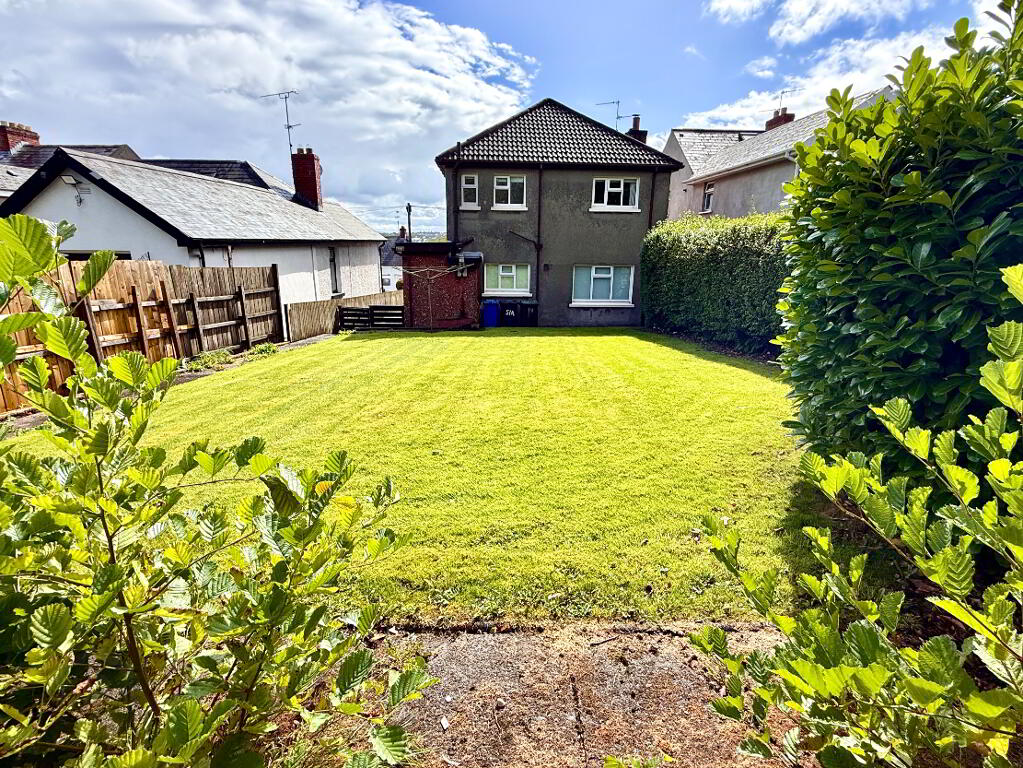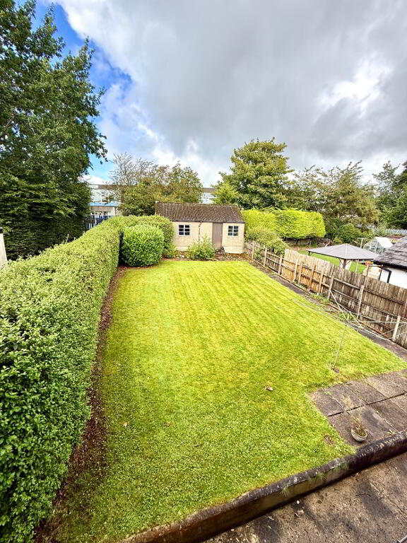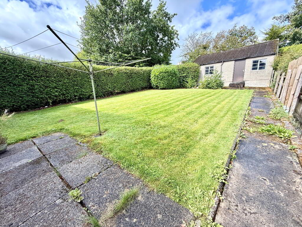 Garden to rear laid in lawn enclosed by mature hedge and fence.