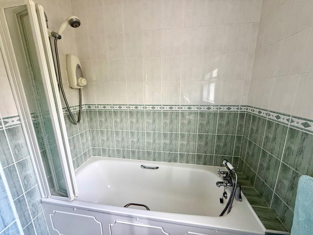 Bathroom Bath with shower over head, wash hand basin, fully tiled walls, tiled floor.