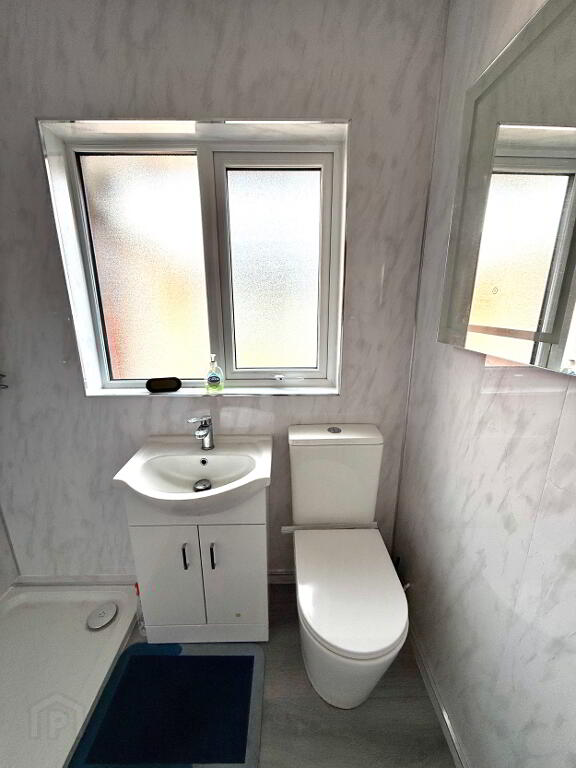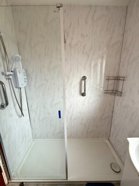 Shower Room Walk in power shower, wash hand basin set in vanity unit, WC, walls fully panelled.