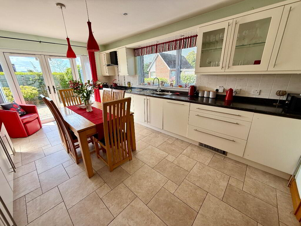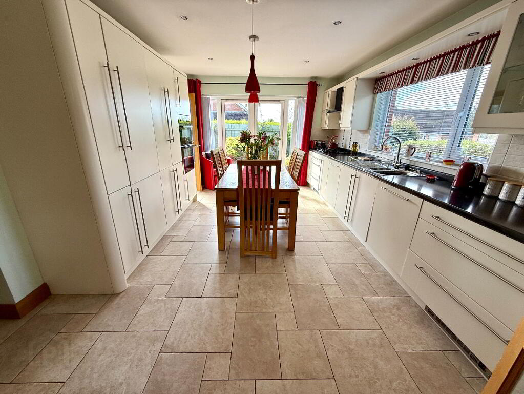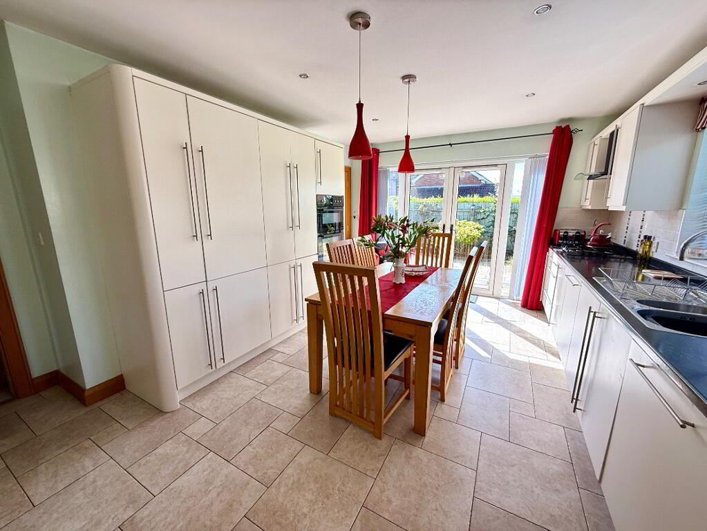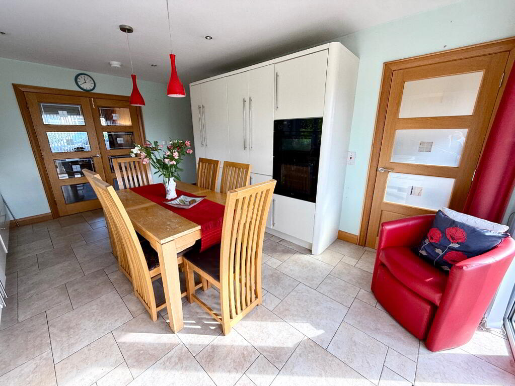 Kitchen/Dining 17'4 x 13'7 (to widest points) Dual aspect, eye and low level units, glazed display unit, bank of tall units comprising of larder cupboard, integrated fridge/freezer and broom cupboard, double wall oven, 1 1/2 bowl stainless steel sink unit with mixer tap, hob and extractor fan, integrated dishwasher, partly tiled walls, tiled floor, recessed lighting, underfloor heating.