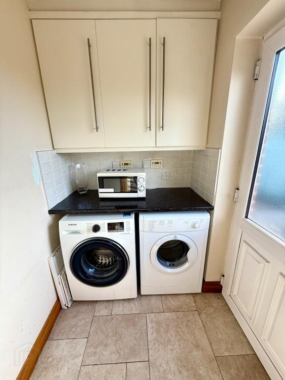 Utility Room Eye level units, plumbed for washing machine, space for tumble dryer, partly tiled walls, tiled floor.