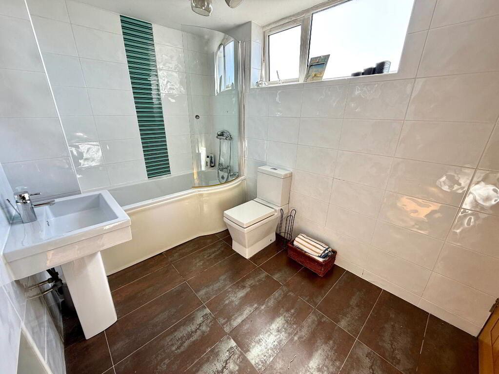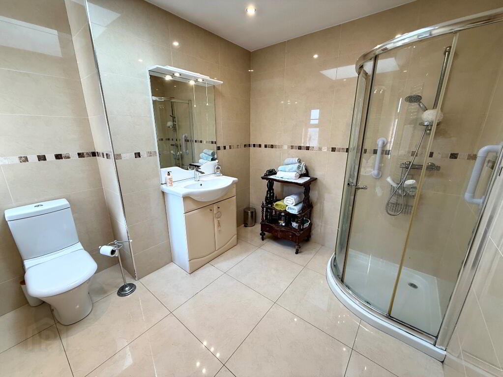 Shower Room Fully tiled walk in shower, wash hand basin set in vanity unit, WC, fully tiled walls, tiled floor, recessed lighting, heated towel rail.