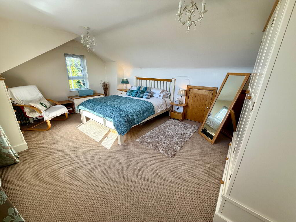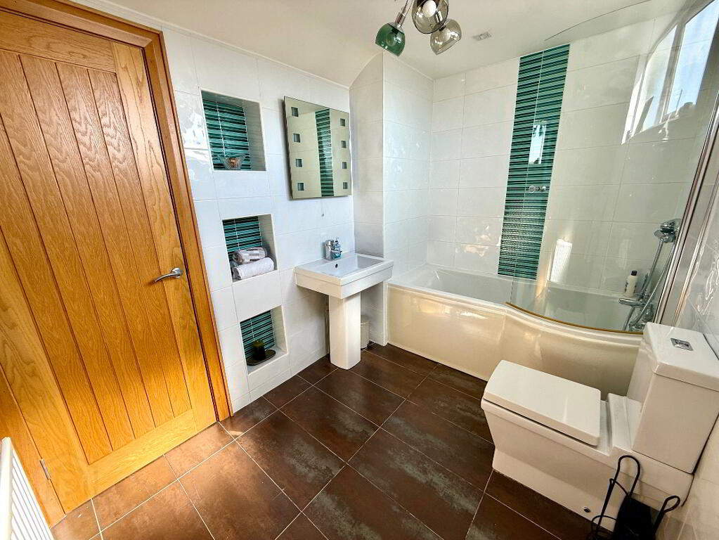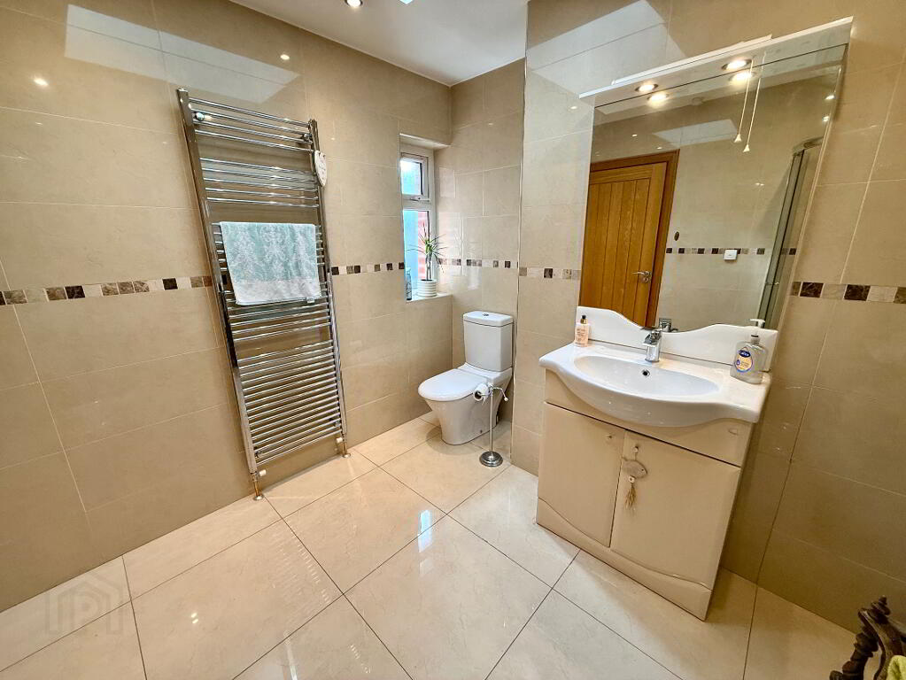 Bedroom 3 11'3 x 9'9 Bathroom Bath with shower attachment to tap, wash hand basin and WC, fully tiled walls with open display shelves, tiled floor, walk in hotpress with lighting.