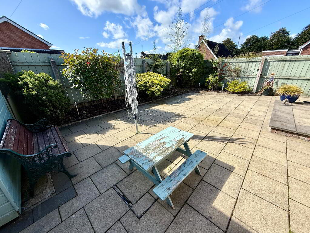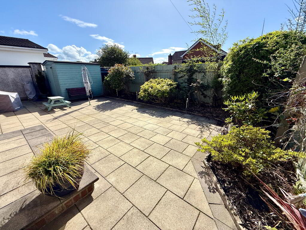 Garden area to front laid in lawn enclosed by wall and hedge.