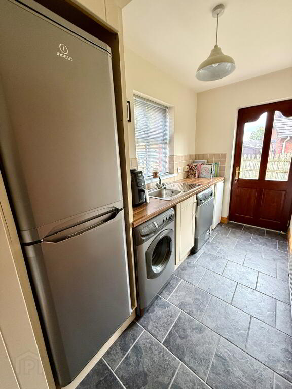Utility Room 12' x 5'3 (to widest points) Low level unit, larder cupboard, single drainer stainless steel sink unit with mixer tap, plumbed for washing machine, space for tumble dryer, partly tiled walls, tiled floor.