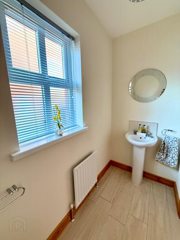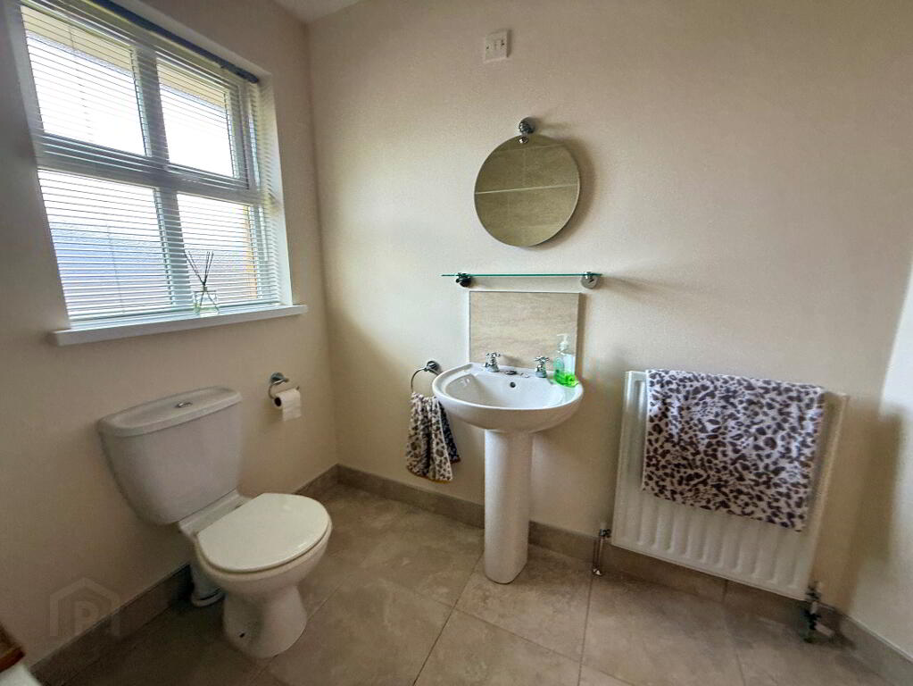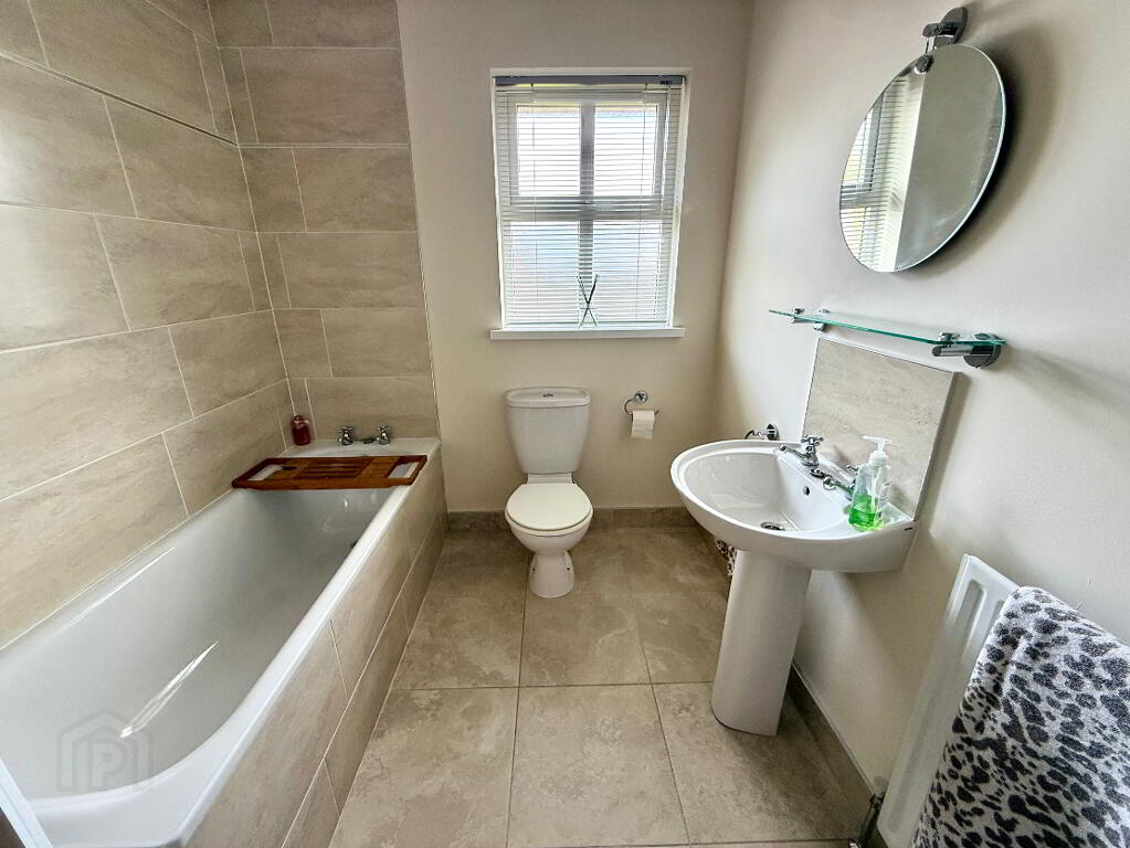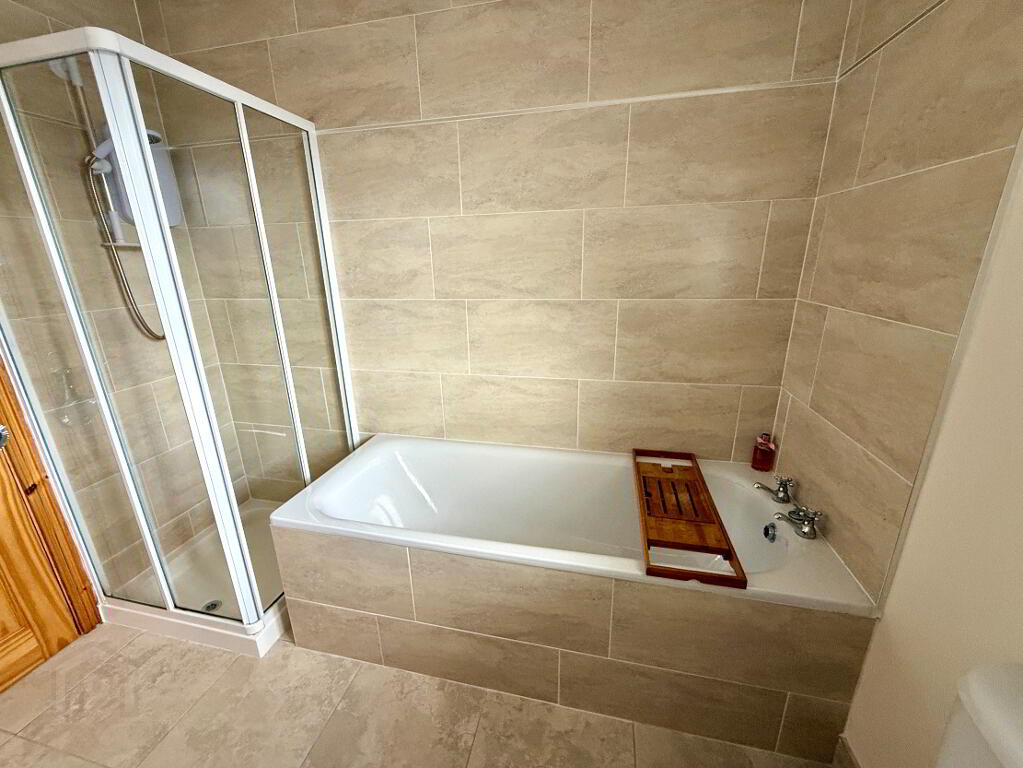 Bathroom Bath, wash hand basin and WC, fully tiled walk in electric shower, partly tiled walls, tiled floor.