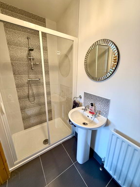 En-suite Fully tiled walk in shower, wash hand basin and WC, partly tiled wall, tiled floor.
