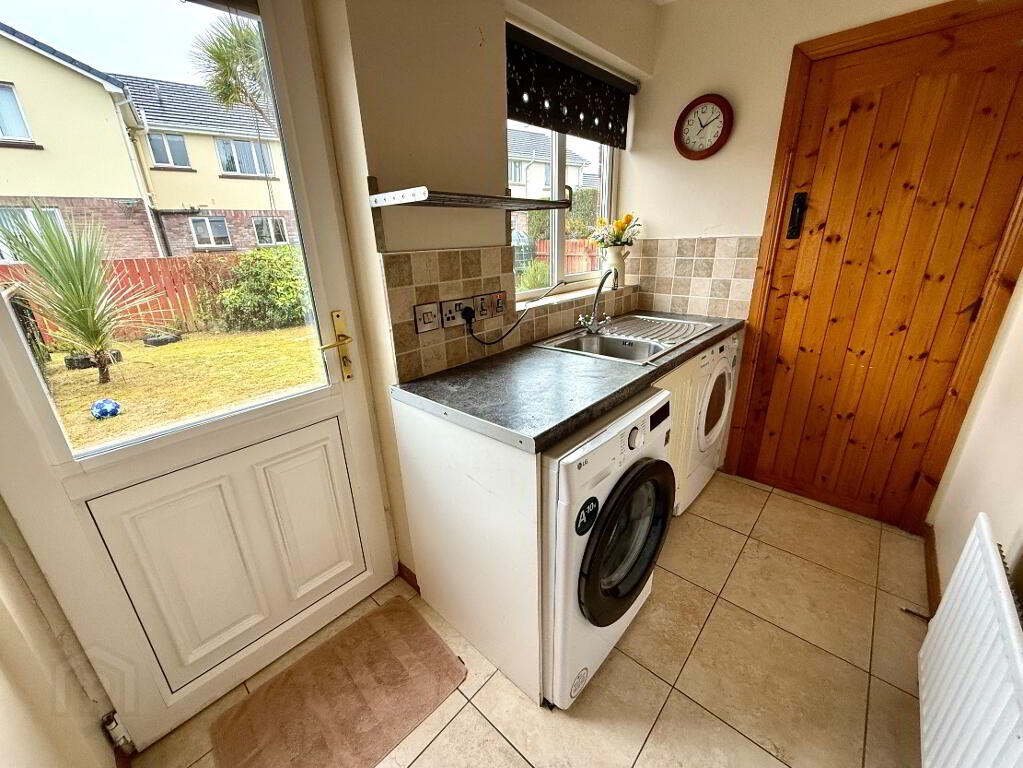 Utility Room Single drainer stainless steel sink unit with mixer tap, plumbed for washing machine, space for tumble dryer, partly tiled walls, tiled floor.