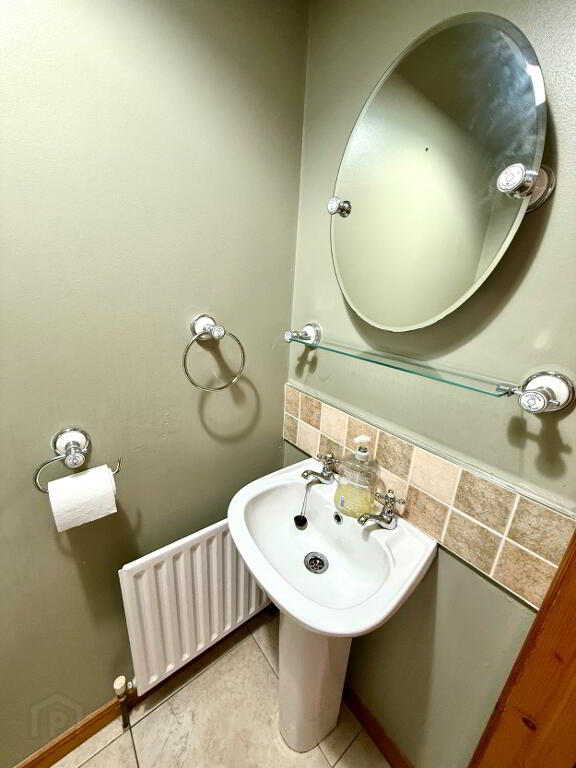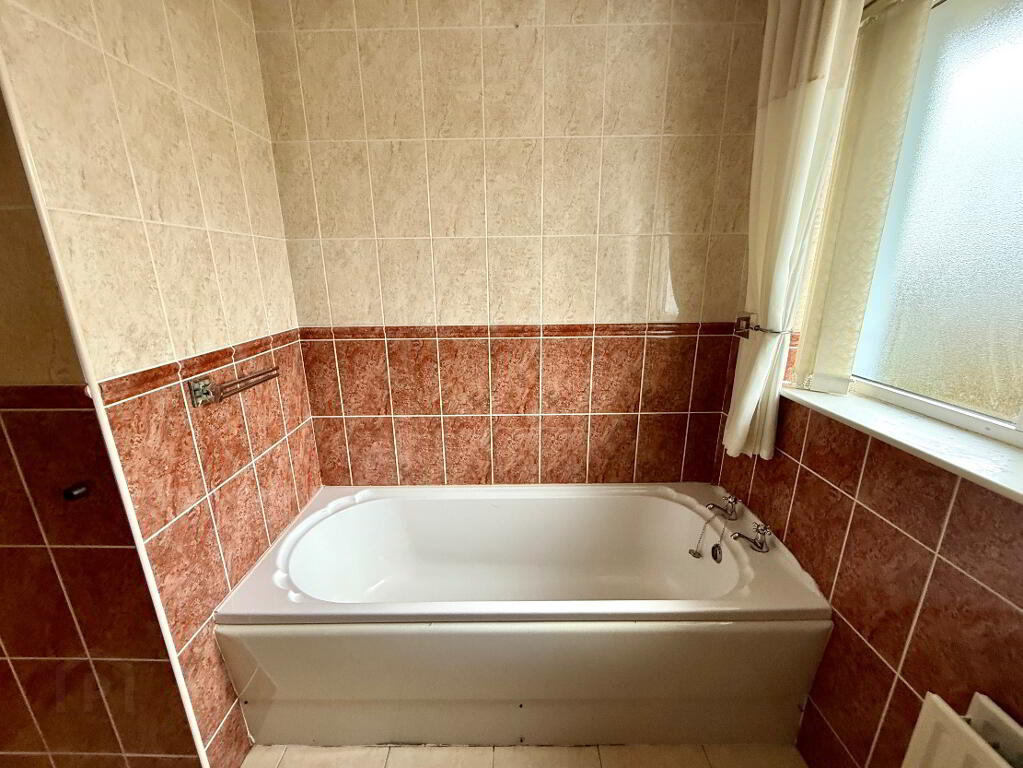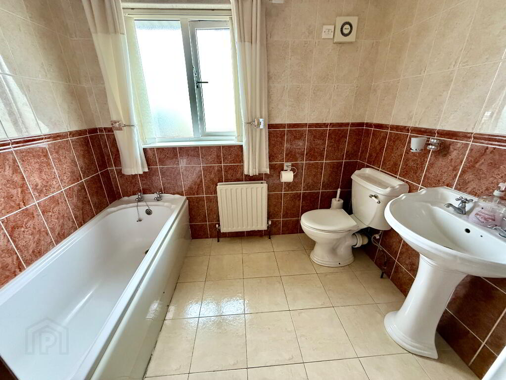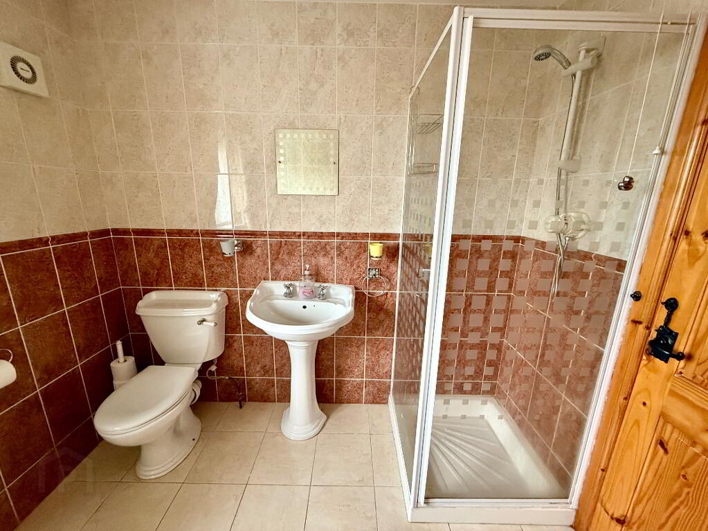 Bathroom Bath, wash hand basin and WC, fully tiled walk in shower, fully tiled walls, tiled floor.