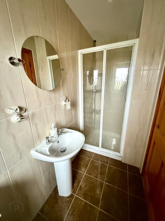 En-suite Fully tiled walk in electric shower, wash hand basin and WC, partly tiled walls, tiled floor.