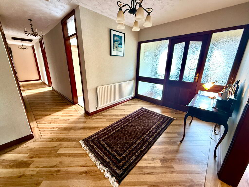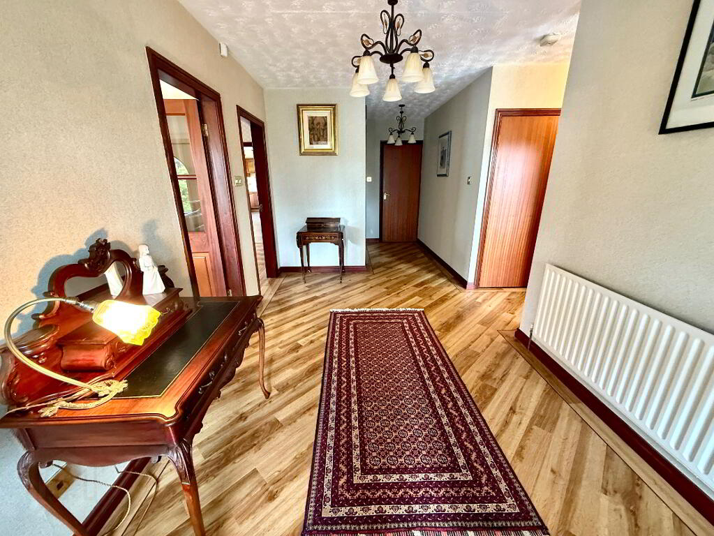 Hallway with cloakroom, double storage cupboard, double hotpress, Amtico wooden effect flooring.