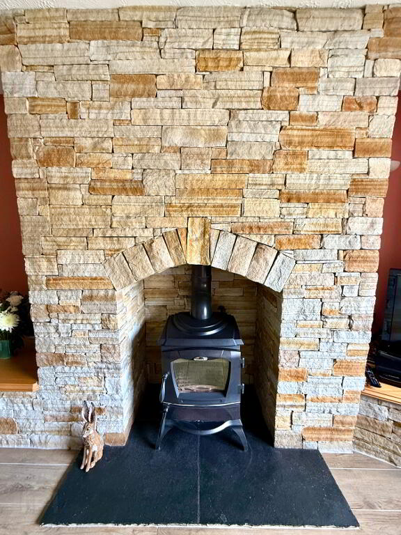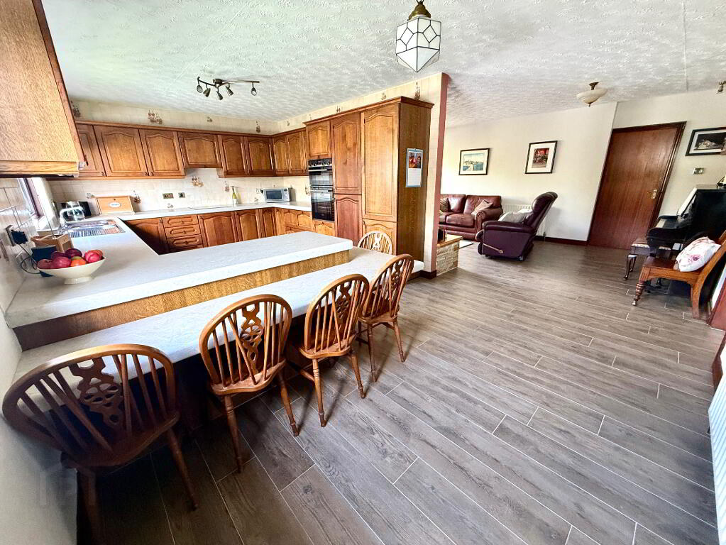 Kitchen/Dining/Family Room 23'10 x 20'11 Eye and low level units, 2 1/4 bowl stainless steel sink unit with mixer tap, hob, double wall oven, extractor fan, fridge/freezer, larder cupboard, integrated dishwasher, integrated washing machine, glazed display unit, breakfast bar with seating, wine rack, Stanley multi fuel stove, tiled floor.