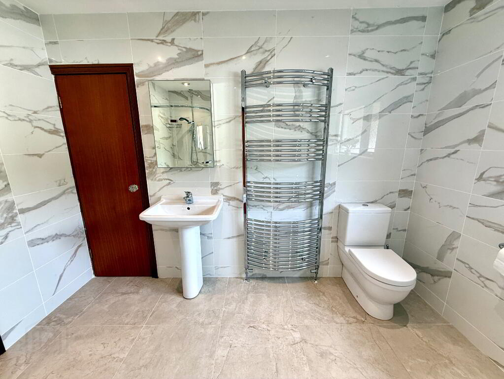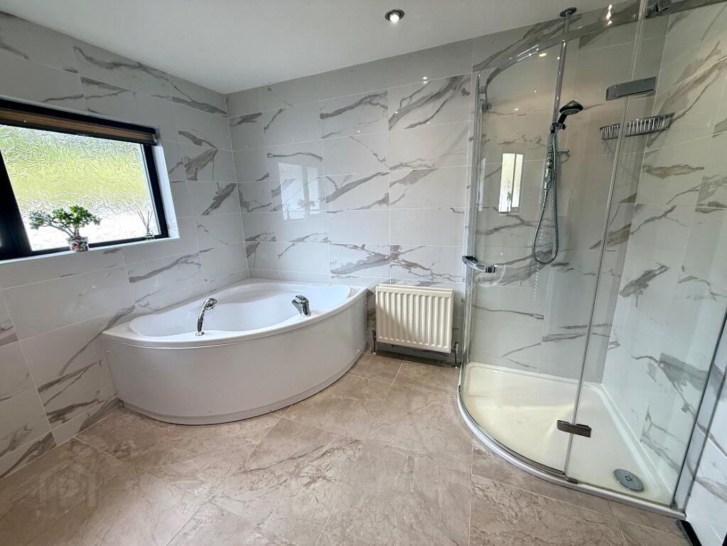 Bathroom 10'8 x 9'4 Corner bath, wash hand basin and WC, fully tiled walk in shower, fully tiled walls, tiled floor, recessed lighting, heated towel rail, wall cabinet.
