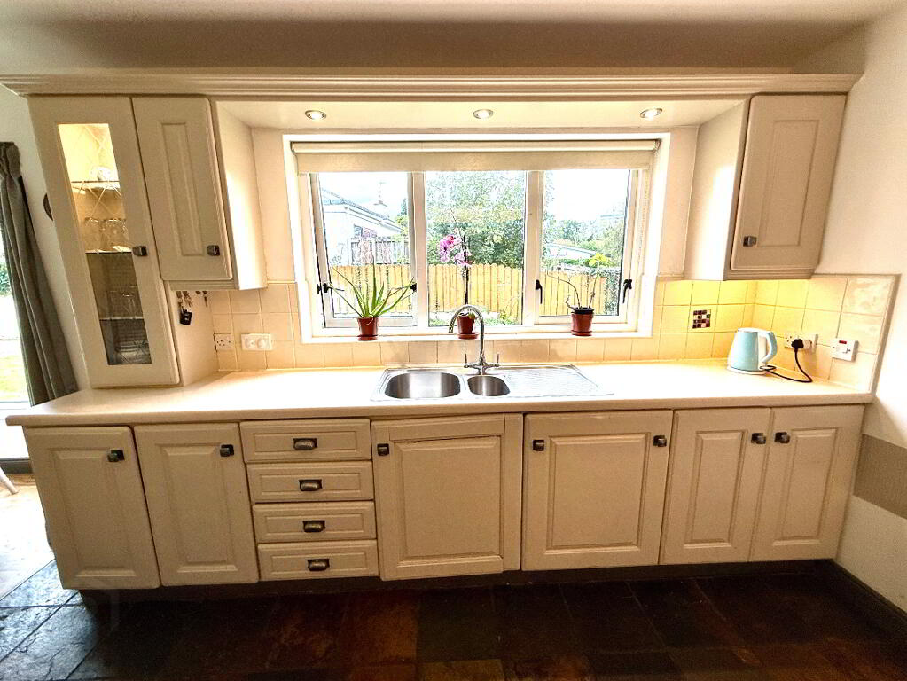 Kitchen/ Dining 21'2 x 13'7 (to widest points) Eye and low level units, 1 1/2 bowl stainless steel sink unit with mixer tap, hob, oven and extractor fan, integrated fridge/freezer, integrated dishwasher, open display shelves, partly tiled walls, tiled floor in kitchen area, concealed lighting above and below eye level units, bay windows in dining area.