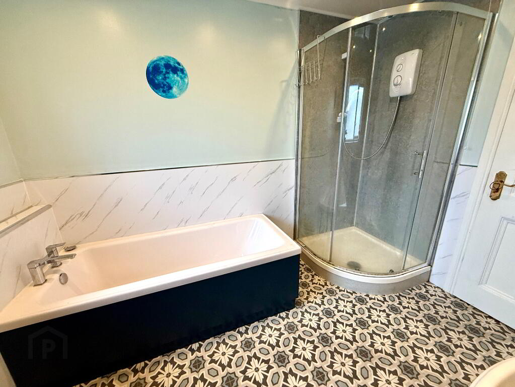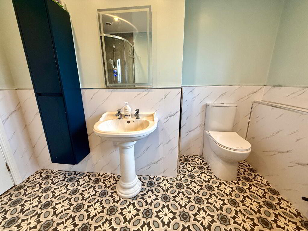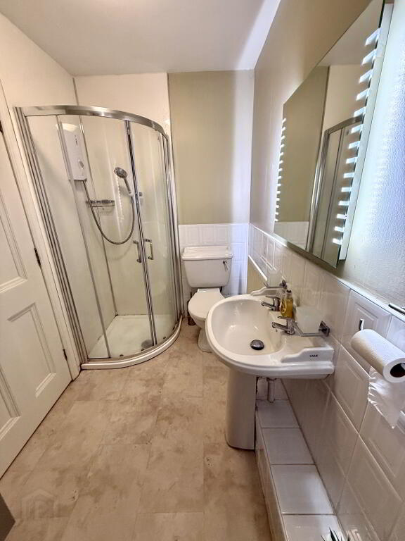En-suite Walk in electric shower, wash hand basin and WC, partly tiled walls.