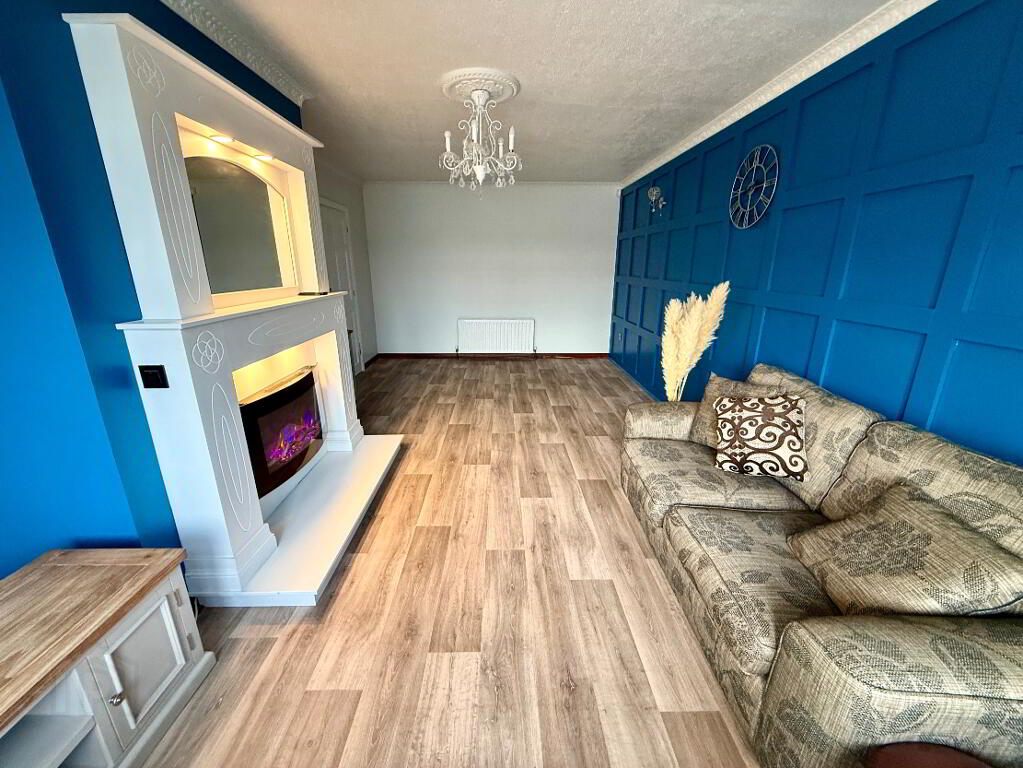 Lounge 20'10 x 11'8 (to widest points) Bow window, wooden fireplace with matching over mantle mirror and electric fire, ceiling cornicing, feature wood panelled wall, wall lights.