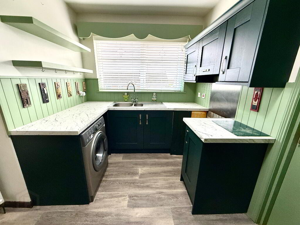 Kitchen 10'5 x 10'5 (to widest points) Eye and low level units, single drainer stainless steel sink unit with mixer tap, wired for electric cooker, plumbed for washing machine, breakfast bar.