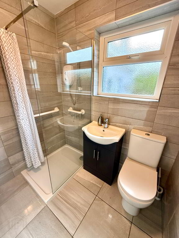Shower Room Fully tiled walk in shower, wash hand basin set in vanity unit, WC, fully tiled walls, tiled floor.