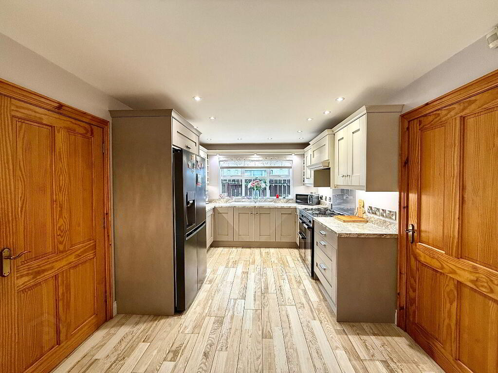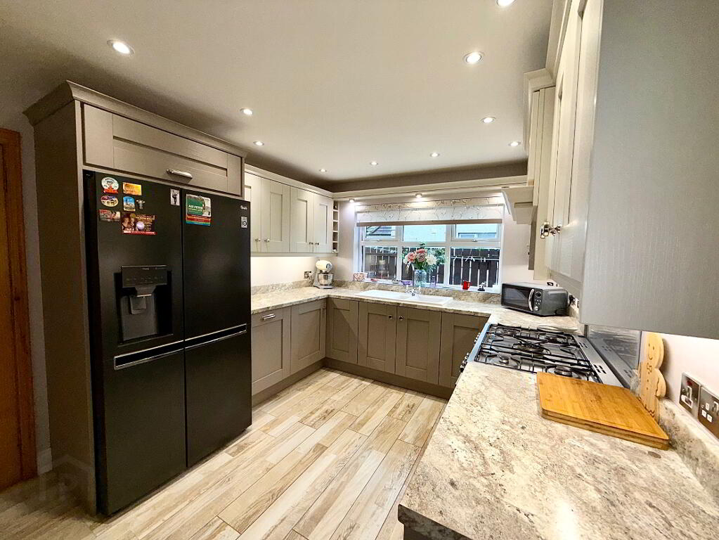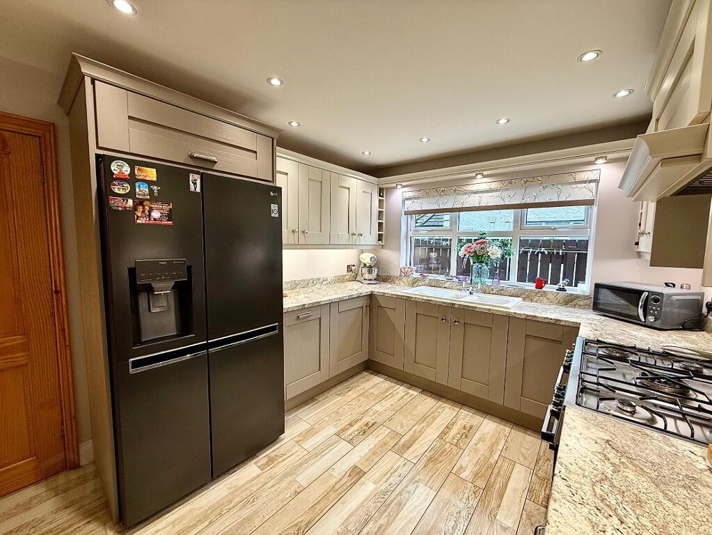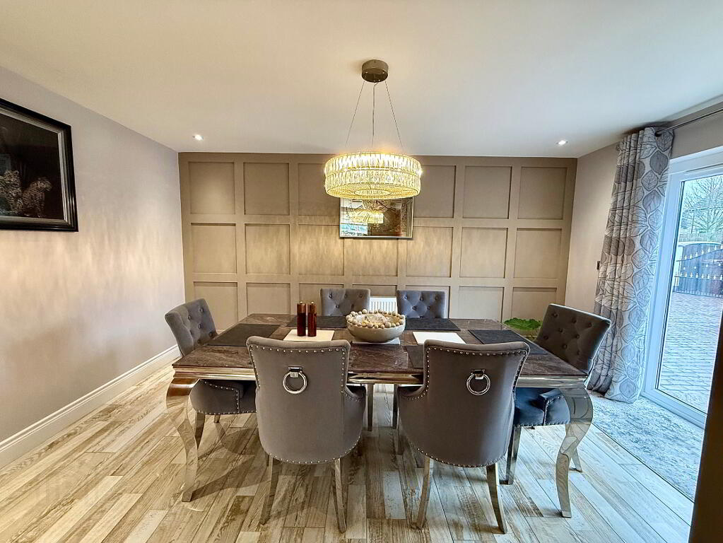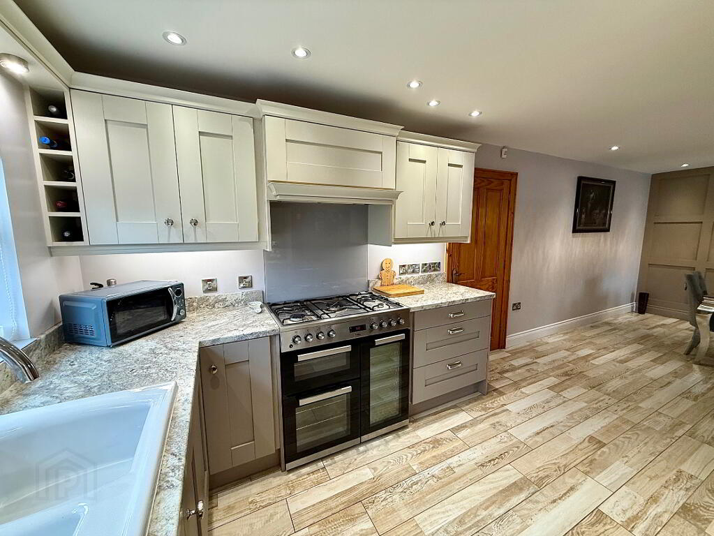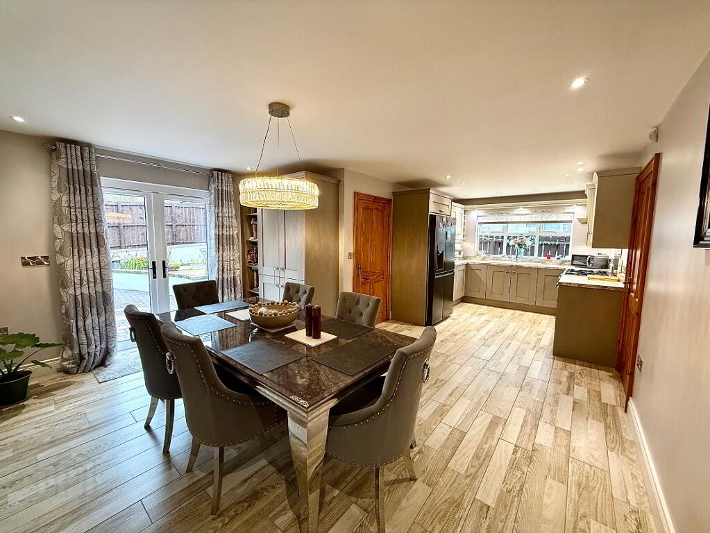 Kitchen/Dining 23'11 x 14'10 (to widest points) Eye and low level units with concealed lighting, 1 1/4 bowl white sink unit with mixer tap, integrated dishwasher, Beko Cooker and extractor fan, larder cupboard, recessed lighting in Kitchen area, wooden effect tiled floor, patio doors.