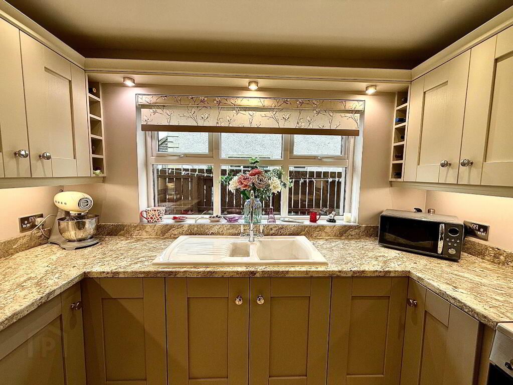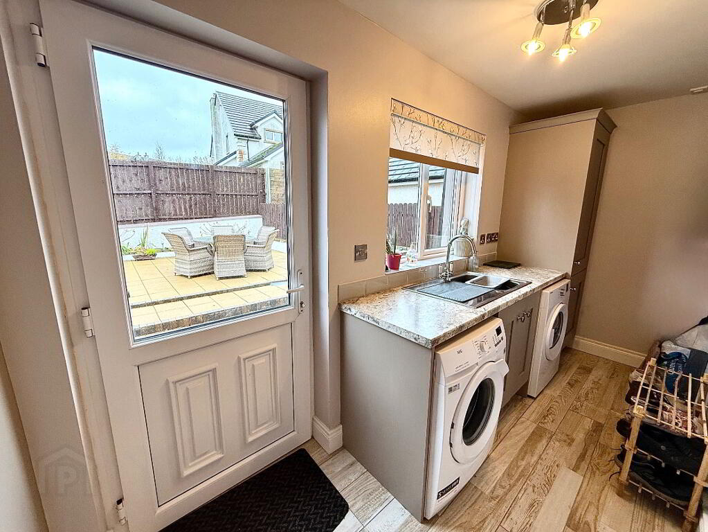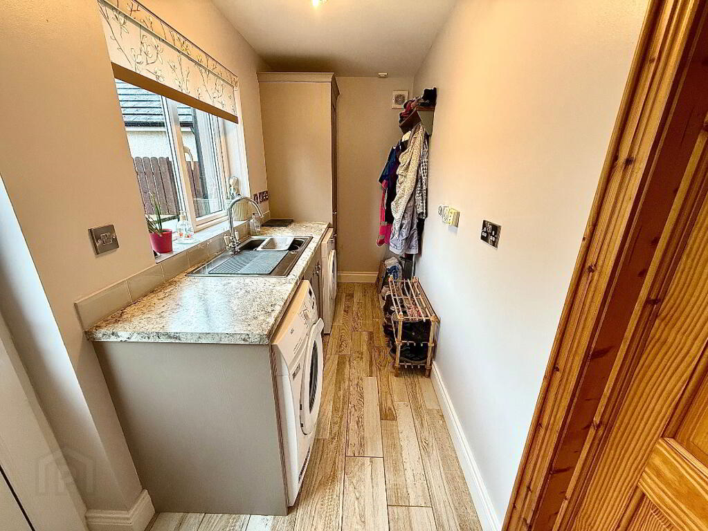Utility Room Low level units, larder cupboard, single drainer stainless steel sink unit with mixer tap, plumbed for washing machine, space for tumble dryer.