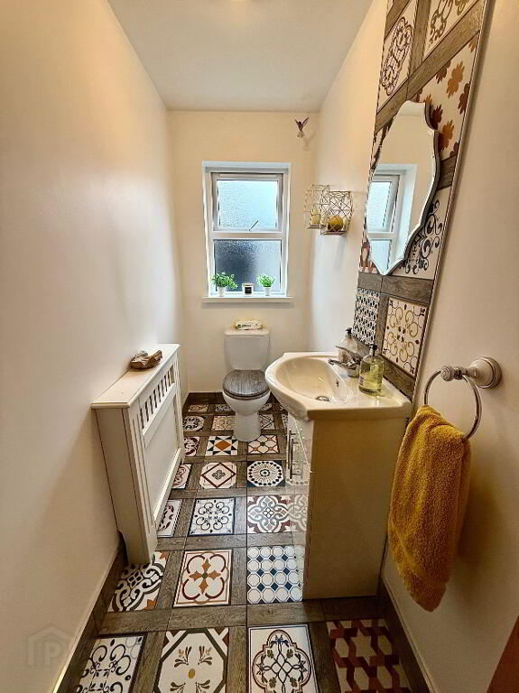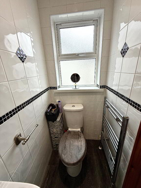 Downstairs WC Wash hand basin and WC, partly tiled walls tiled floor, radiator cover.