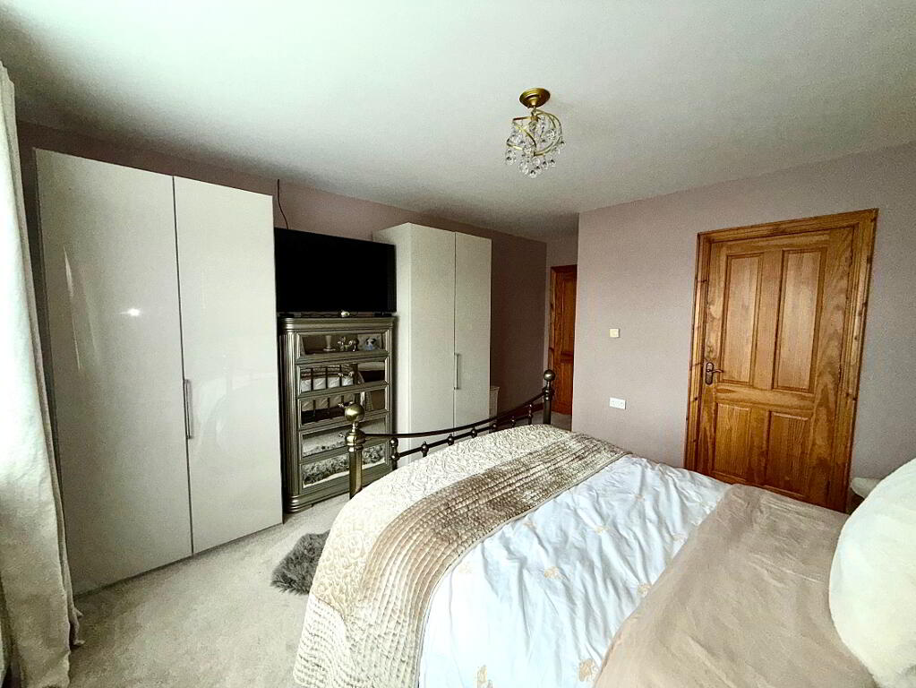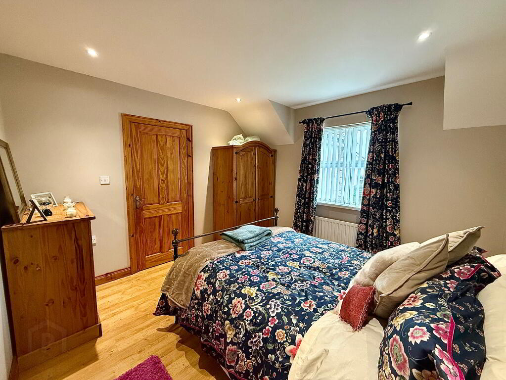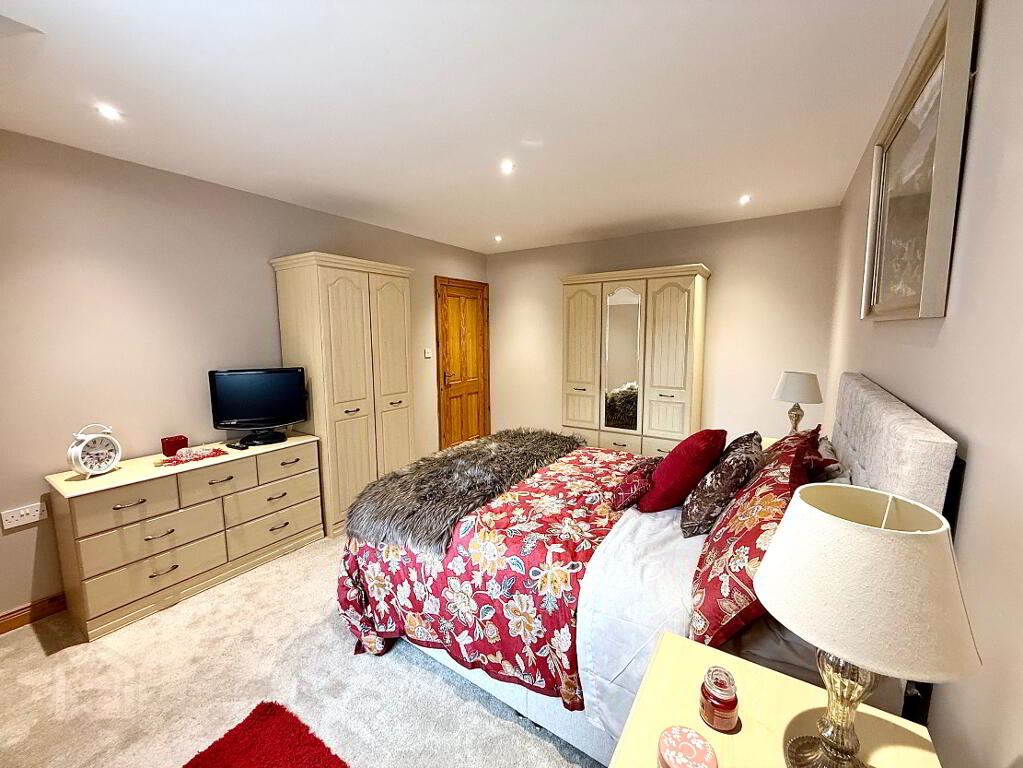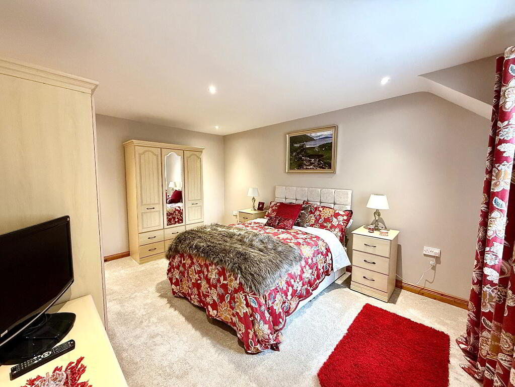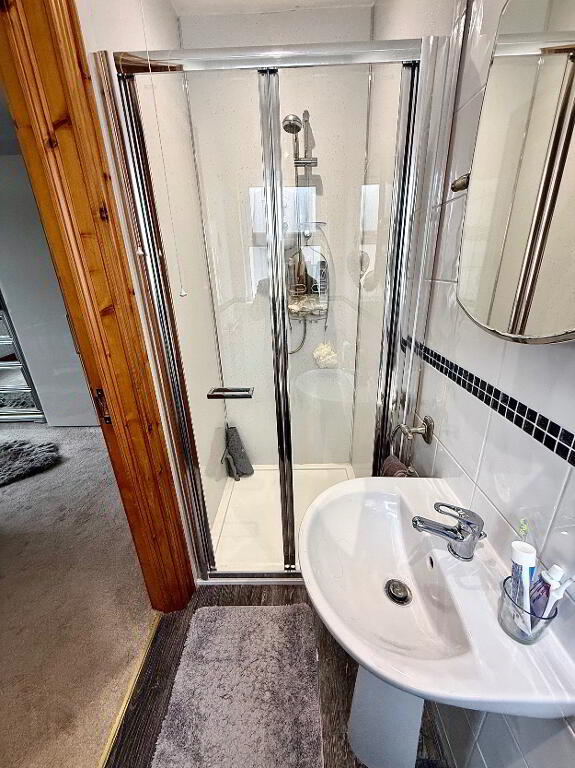 En-suite Fully panelled walk in electric shower, wash hand basin and WC, partly tiled walls, heated towel rail.