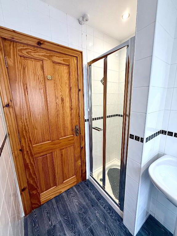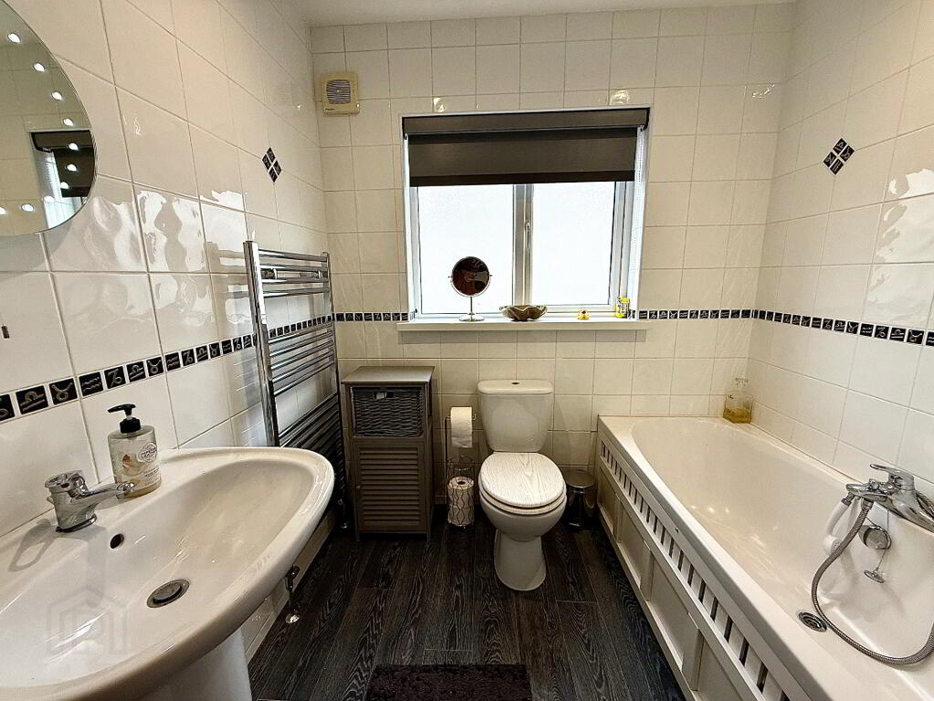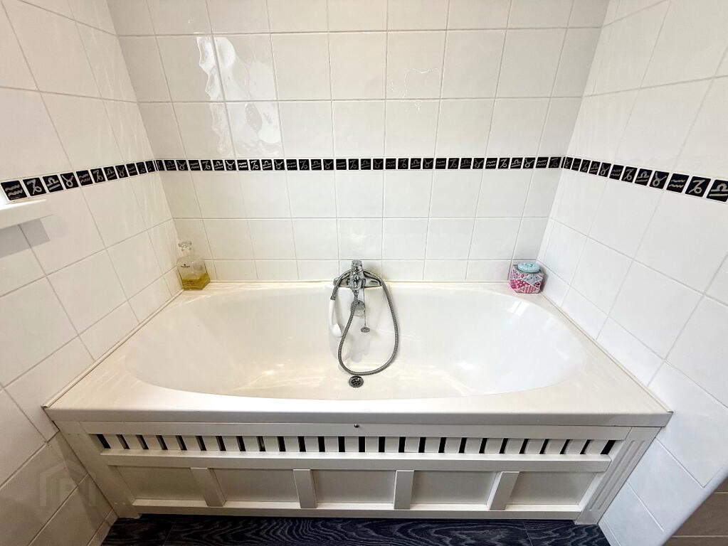 Bathroom Bath with shower attachments to taps, wash hand basin and WC, heated towel rail, fully tiled walk in shower, fully tiled walls, recessed lighting.