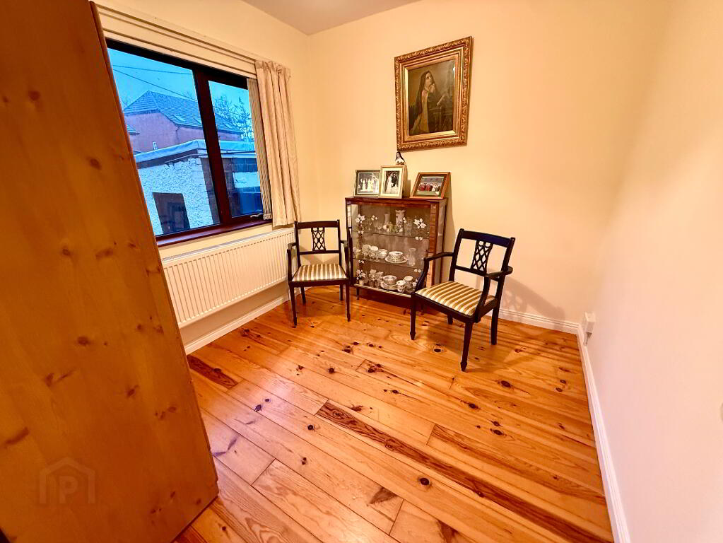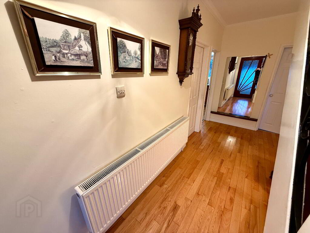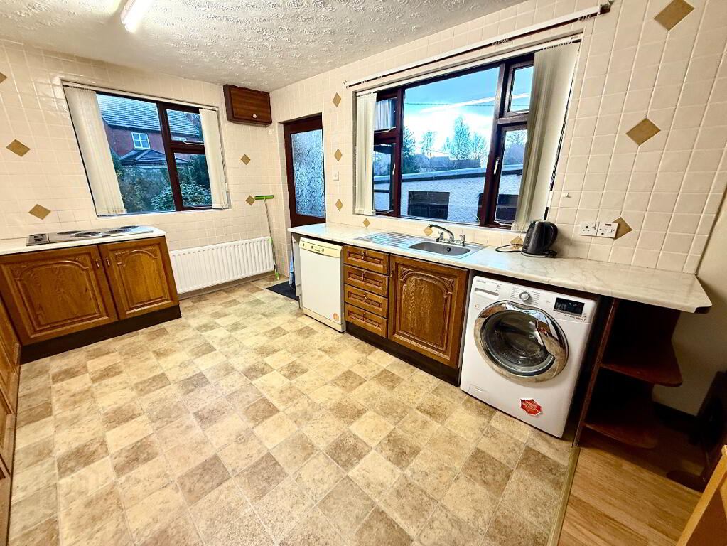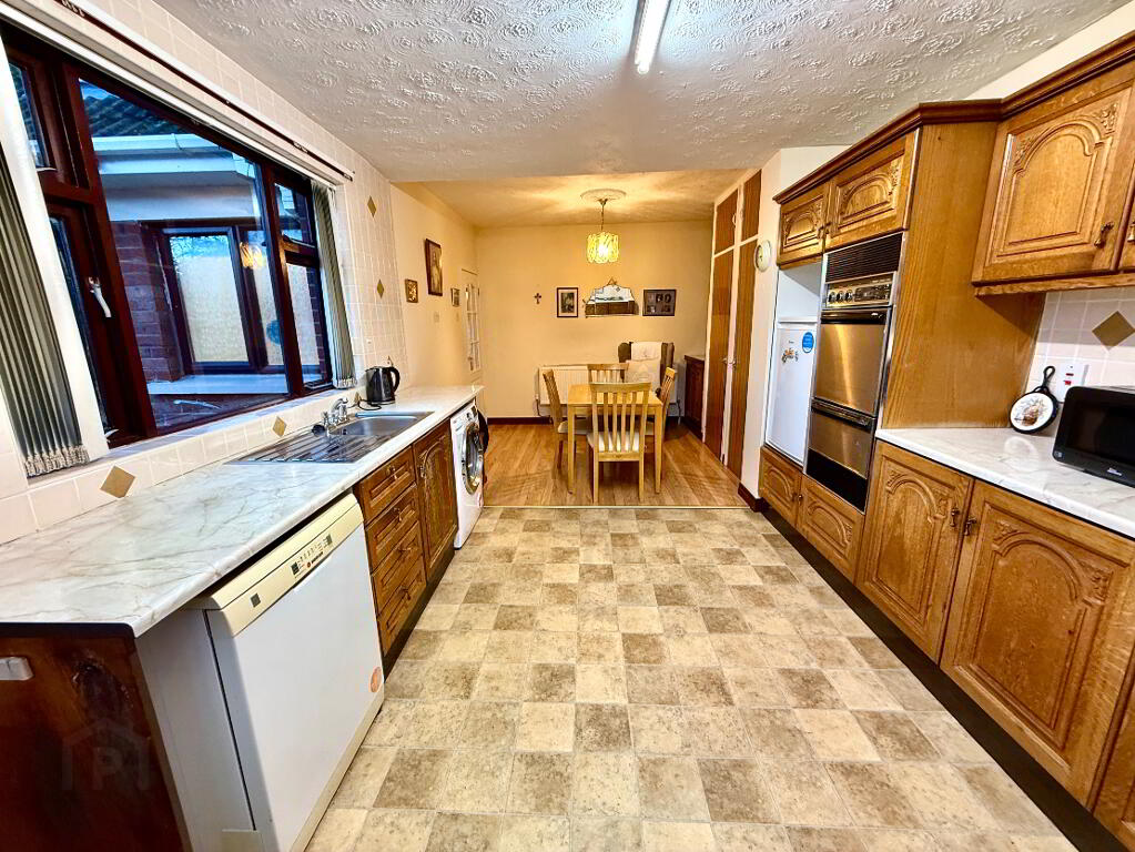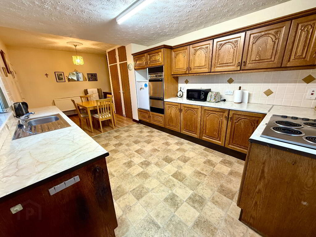 Extended Kitchen/Dining Eye and low level units, single drainer stainless steel sink unit with mixer tap, hob, oven, plumbed for washing machine, plumbed for dishwasher, partly tiled walls, hotpress, storage cupboard, open display shelves, laminated floor in dining area.