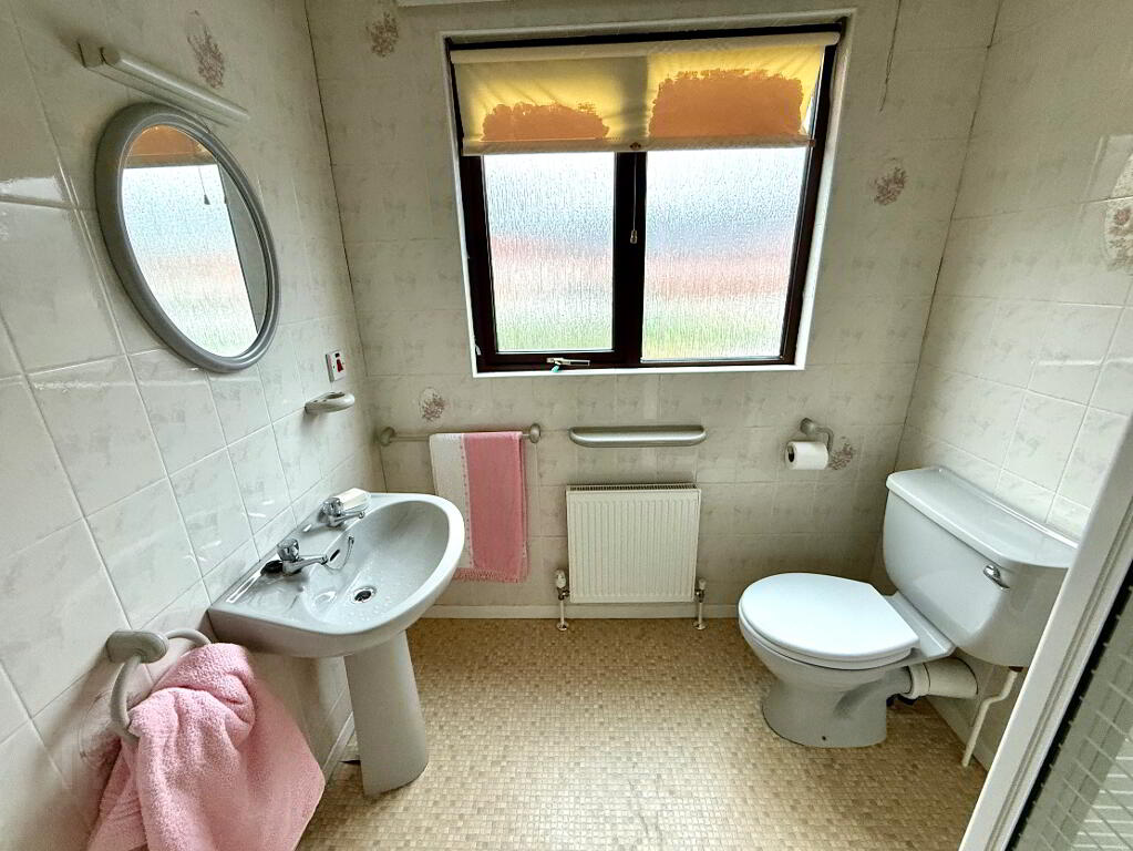 Shower Room Fully tiled walk in shower, wash hand basin and WC, fully tiled walls.
