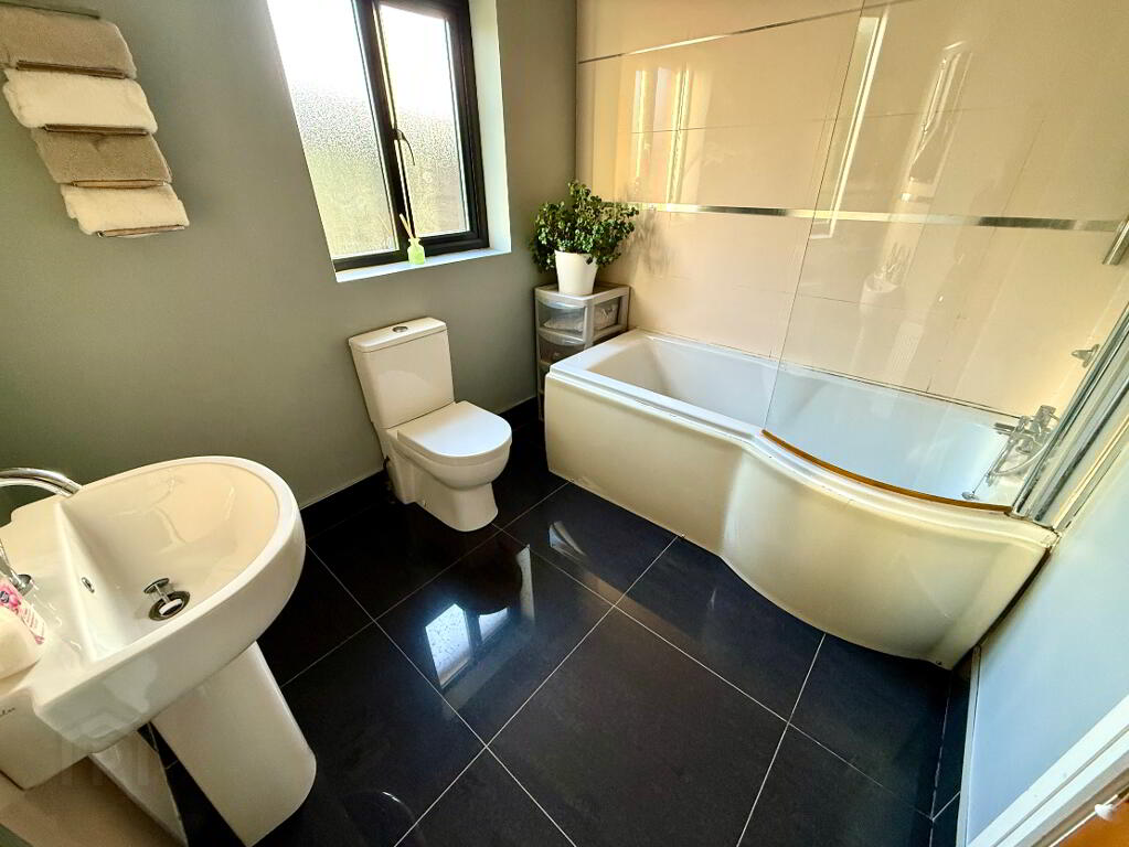 En-suite Fully tiled walk in shower, wash hand basin and WC, partly tiled walls, tiled floor.