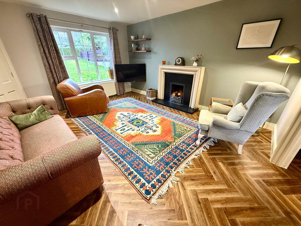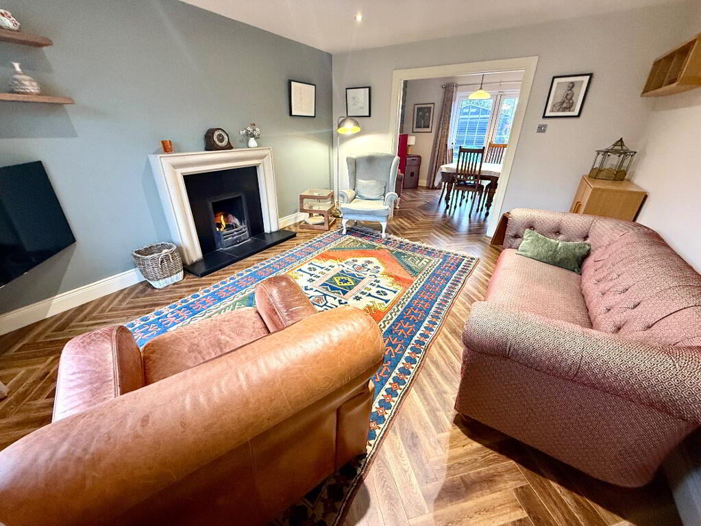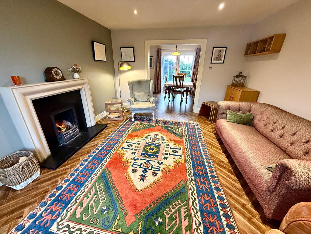 Family Room 13'7 x 12'7 (to widest points) Slate hearth and surround with gas fire insert, Karndean herringbone effect wooden flooring, ceiling cornicing, recessed lighting.