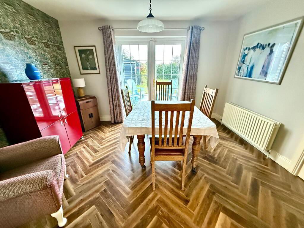 Dining Room 12'8 x 9'9 Herringbone laminated wooden floor, double patio doors.