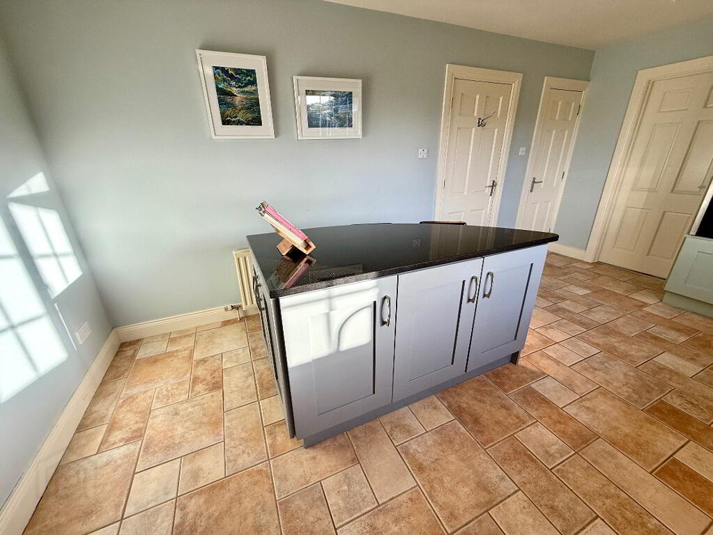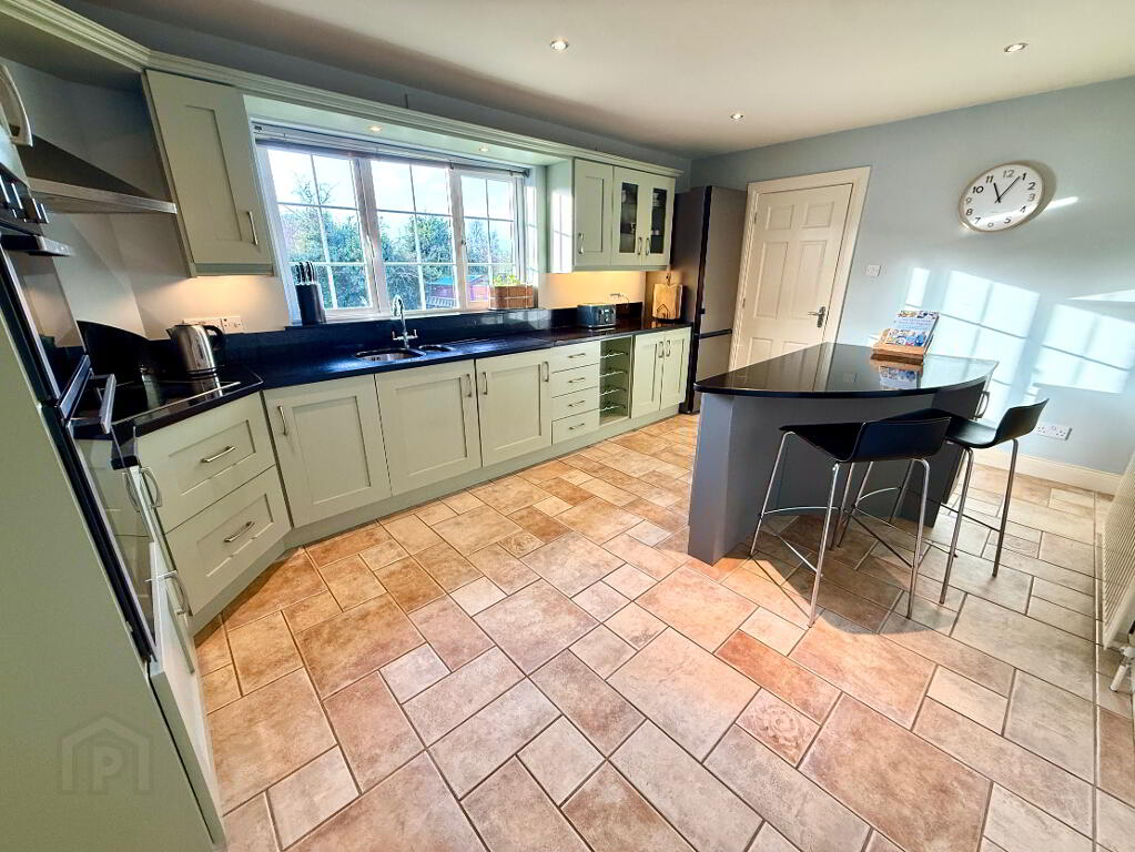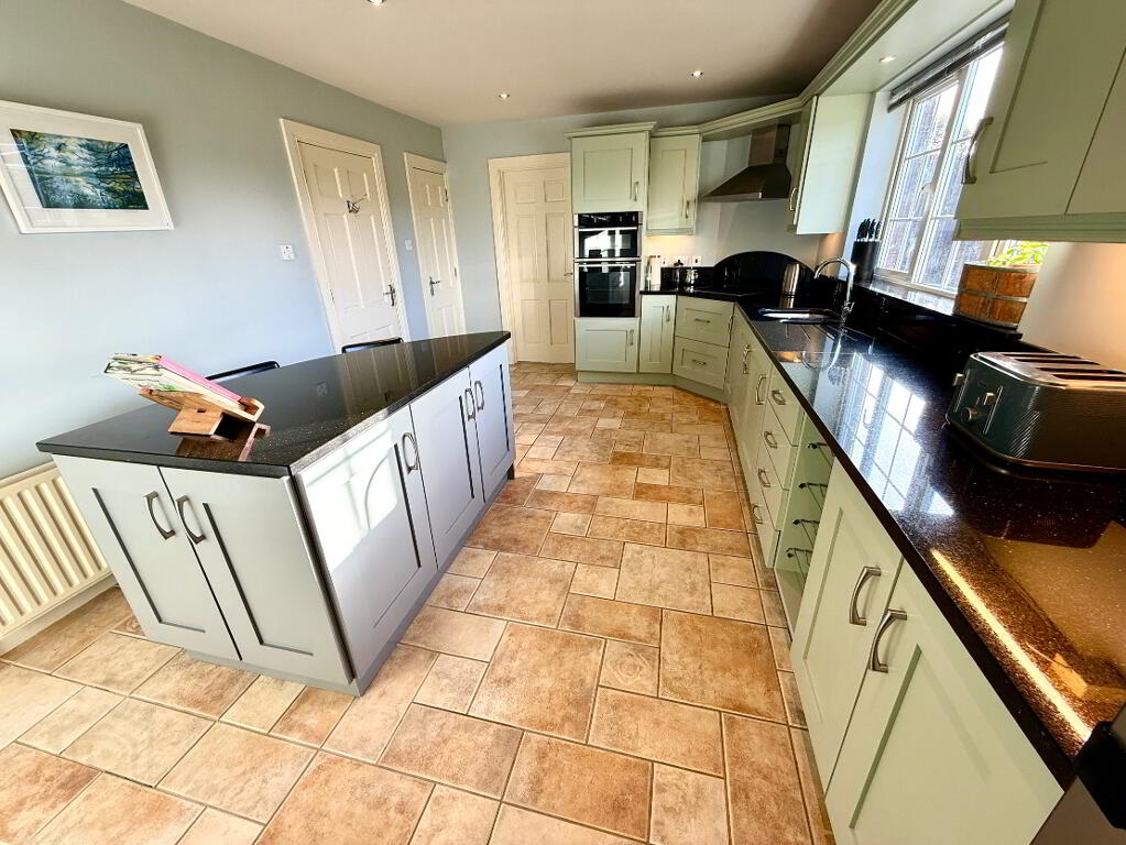 Kitchen/Dining 16'9 x 11'2 (to widest points) Eye and low level units, glazed display shelves, 1 1/4 bowl stainless steel sink unit with mixer tap set in granite worktop, hob, double wall oven and extractor fan, integrated dishwasher, wine rack, island with breakfast bar, understair storage, tiled floor, recessed lighting, concealed lighting below eye level units.