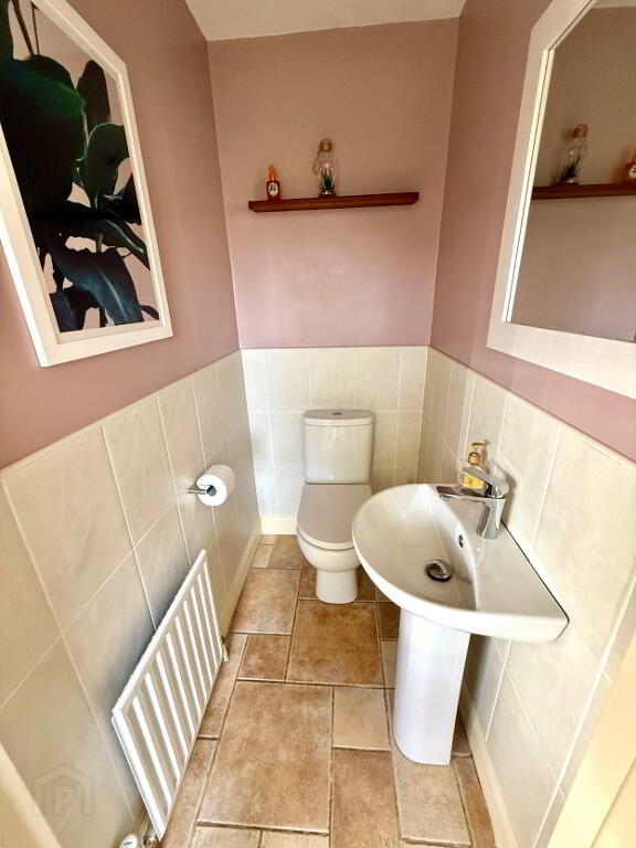 Downstairs WC Wash hand basin and WC, tiled floor, partly tiled walls.