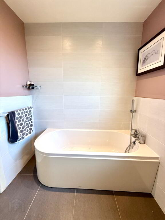 Ensuite Fully tiled walk in shower, wash hand basin set in vanity unit, WC, fully tiled walls, tiled floor.