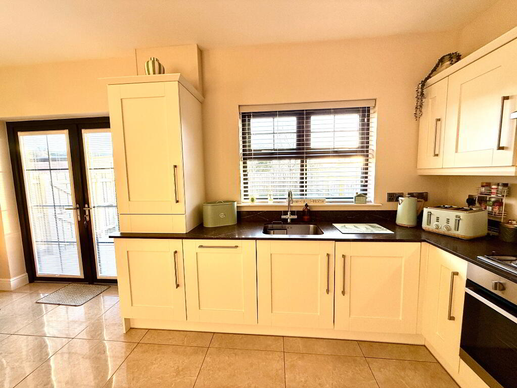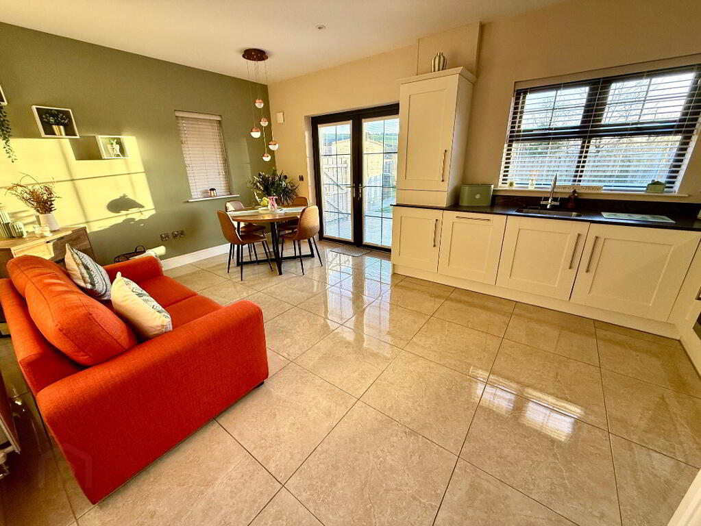Kitchen/Dining 18'11 x 12'8 (to widest points) Eye and low level units, stainless steel sink unit set in Quartz worktop with mixer tap, hob, oven and extractor fan, integrated washer/dryer, integrated dishwasher, integrated fridge/freezer, storage cupboard, tiled floor, double patio doors.