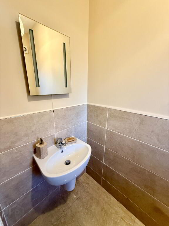 Downstairs WC WC and wash hand basin, partly tiled walls, tiled floor.