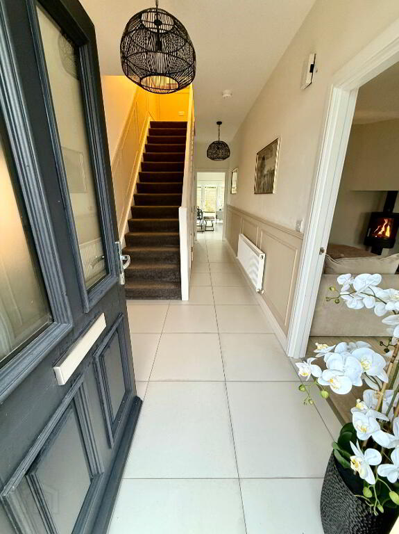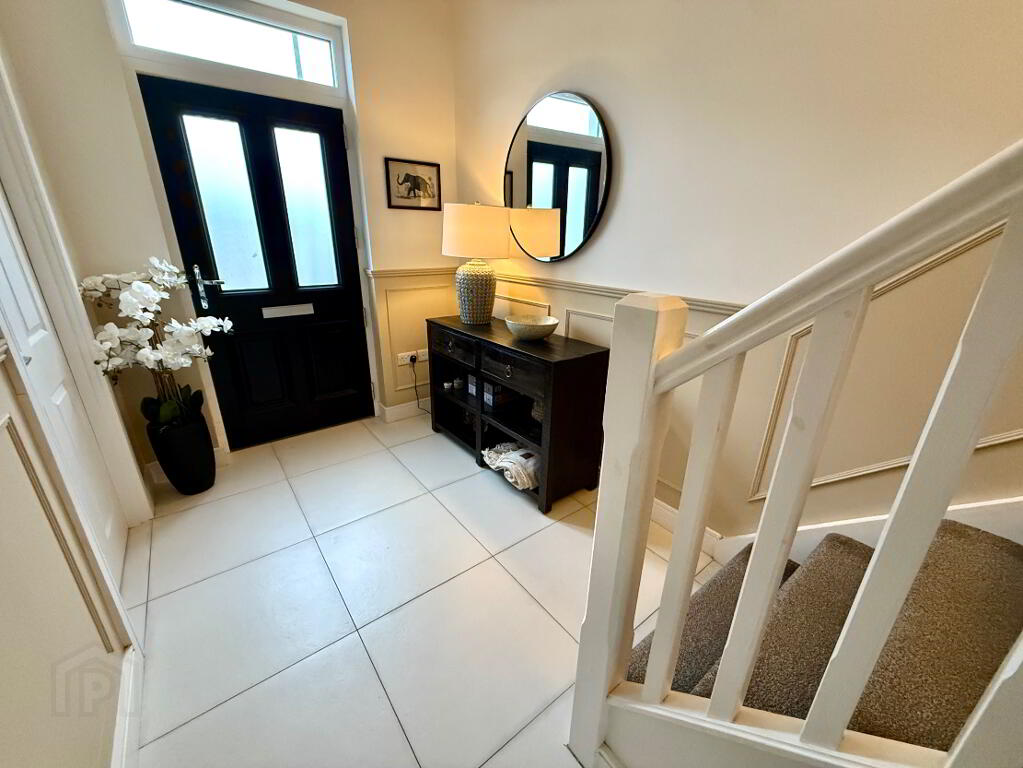 Entrance Hall with tiled floor, walls partially wood panelled, understairs storage.