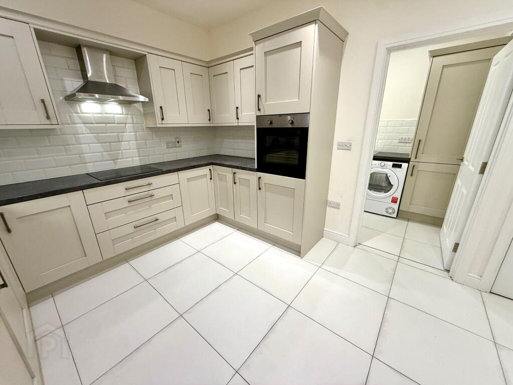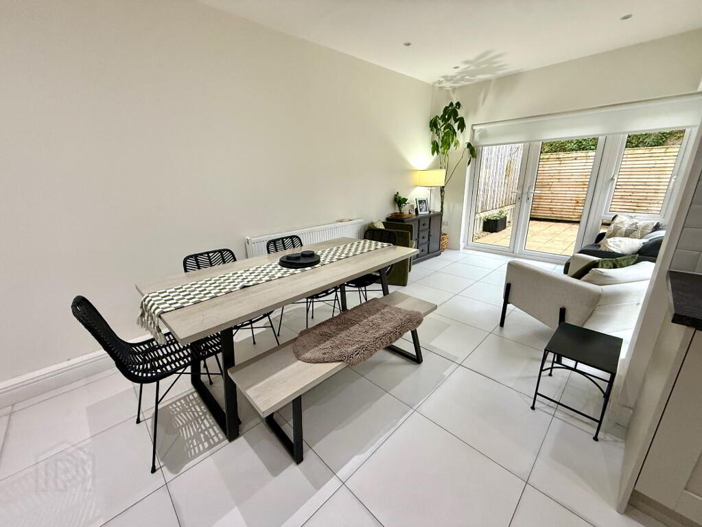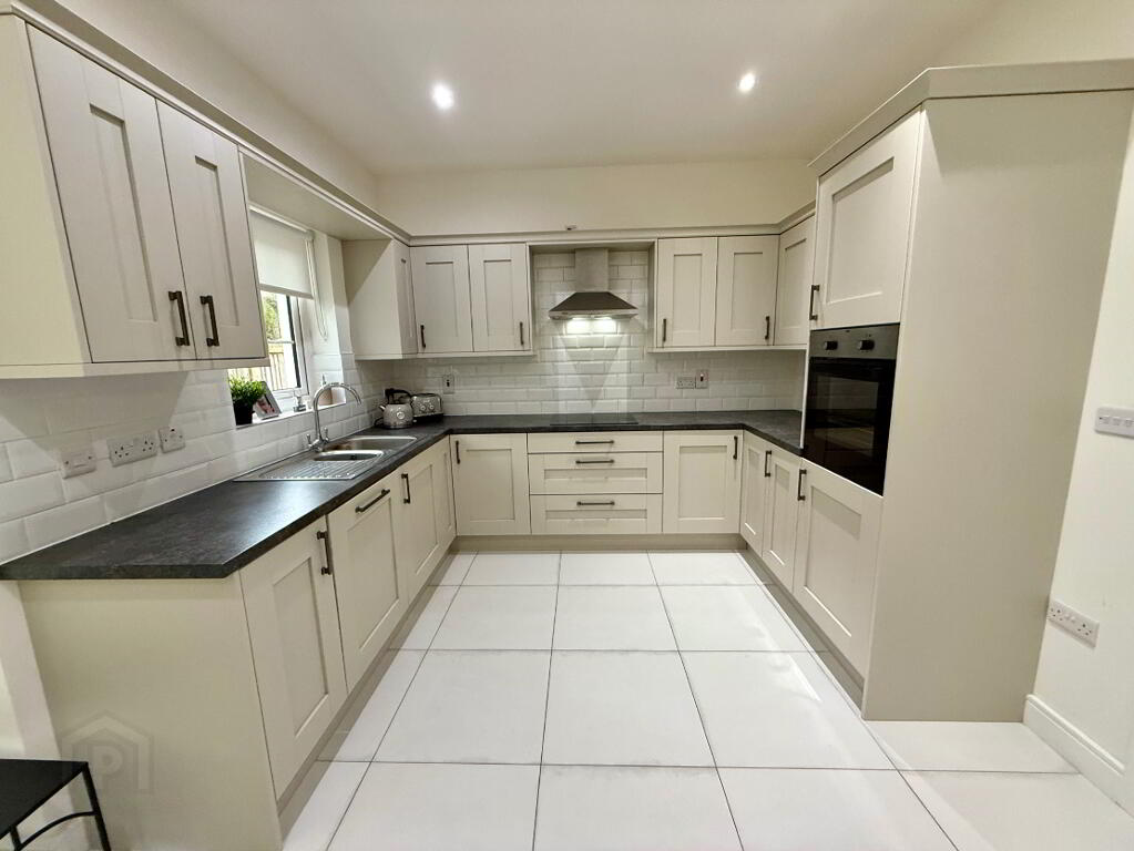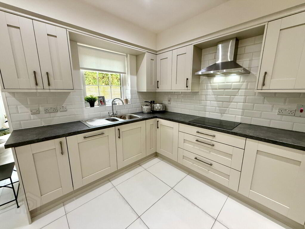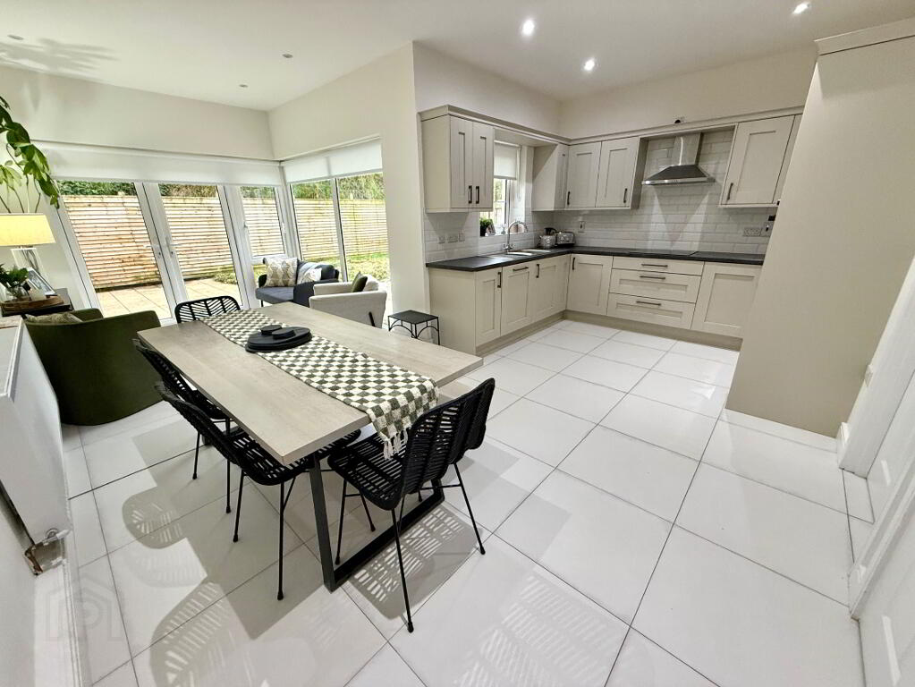 Kitchen/Dining/Sun Room 20' x 17'7 Eye and low level units, 1 1/2 bowl stainless steel sink unit with mixer tap, hob, oven and extractor fan, integrated dishwasher, partly tiled walls, tiled floor, double patio doors, recessed lighting.