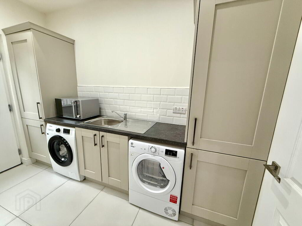 Utility Room 11'1 x 5'5 Low level units, single drainer stainless steel sink unit with mixer tap, broom cupboard, integrated fridge/freezer, plumbed for washing machine, space for tumble dryer, partly tiled walls, tiled floor.