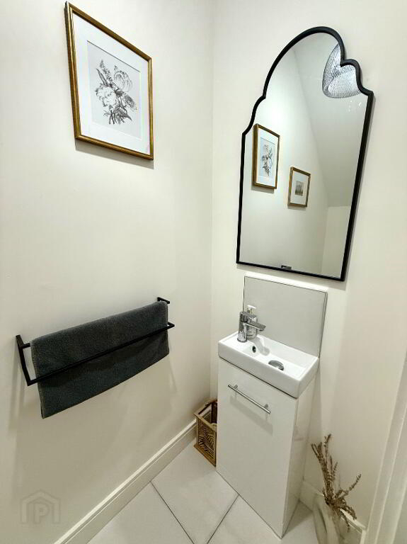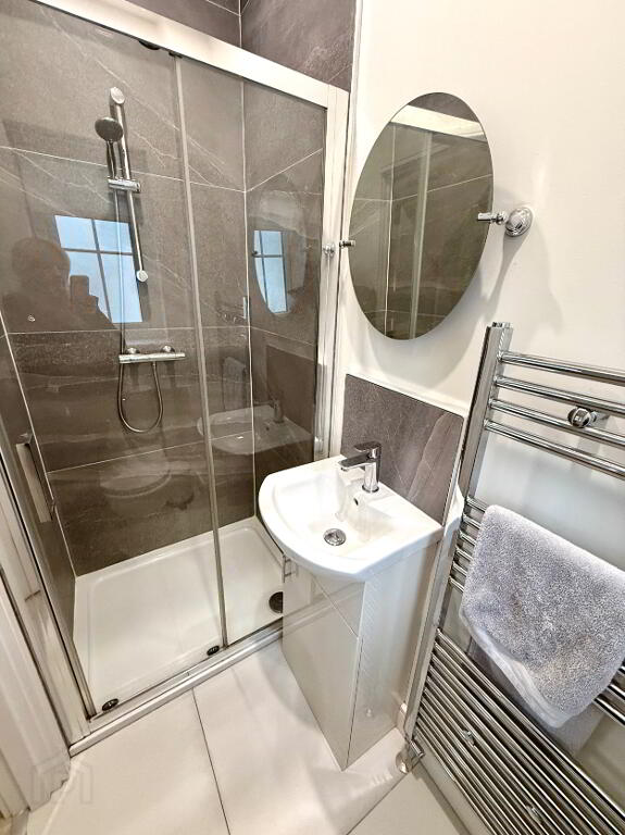Ensuite Fully tiled walk in shower, wash hand basin set in vanity unit, WC, heated towel rail, tiled floor, recessed lighting.