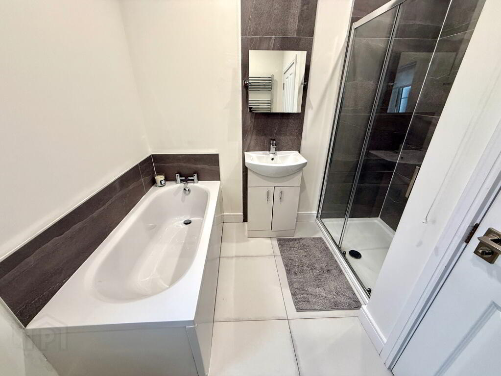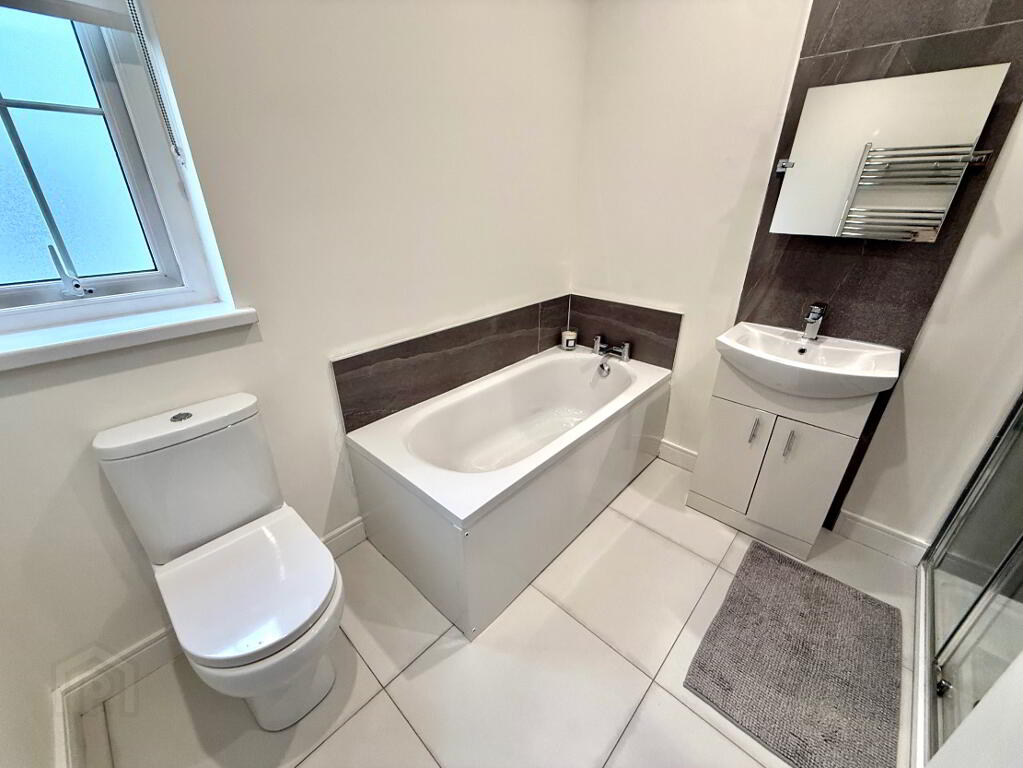 Bathroom Bath, wash hand basin set in vanity unit, fully tiled walk in shower, WC, partly tiled walls, tiled floor, recessed lighting.