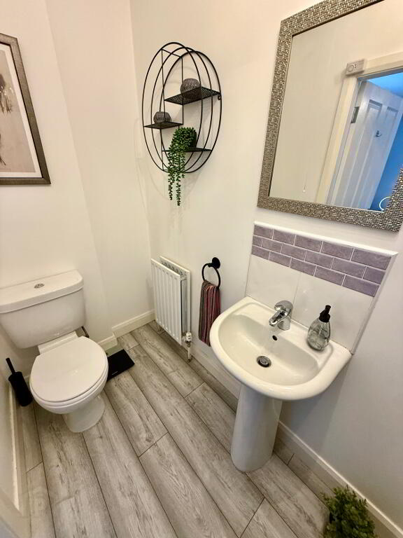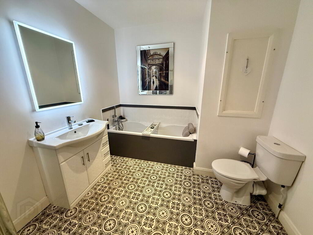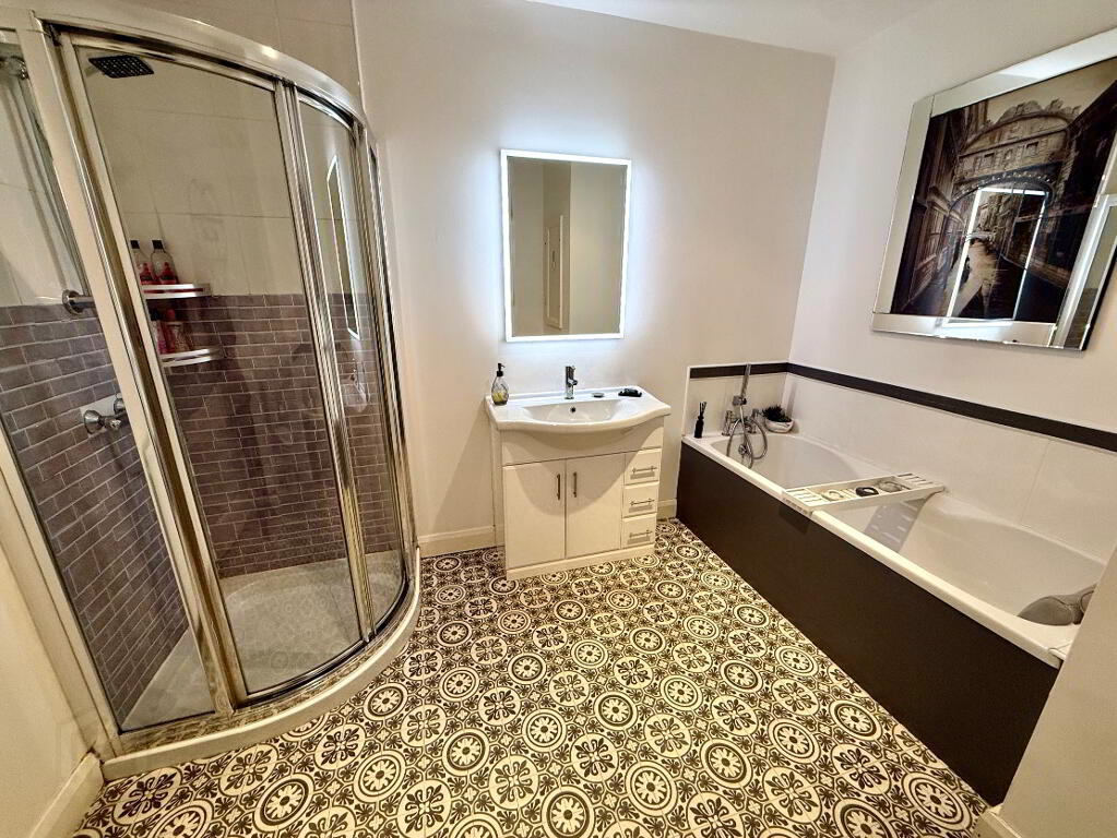 Bathroom Bath, wash hand basin set in vanity unit, WC, fully tiled walk in shower, partly tiled walls, bluetooth wall mirror.