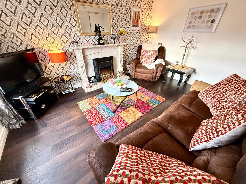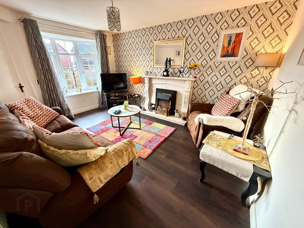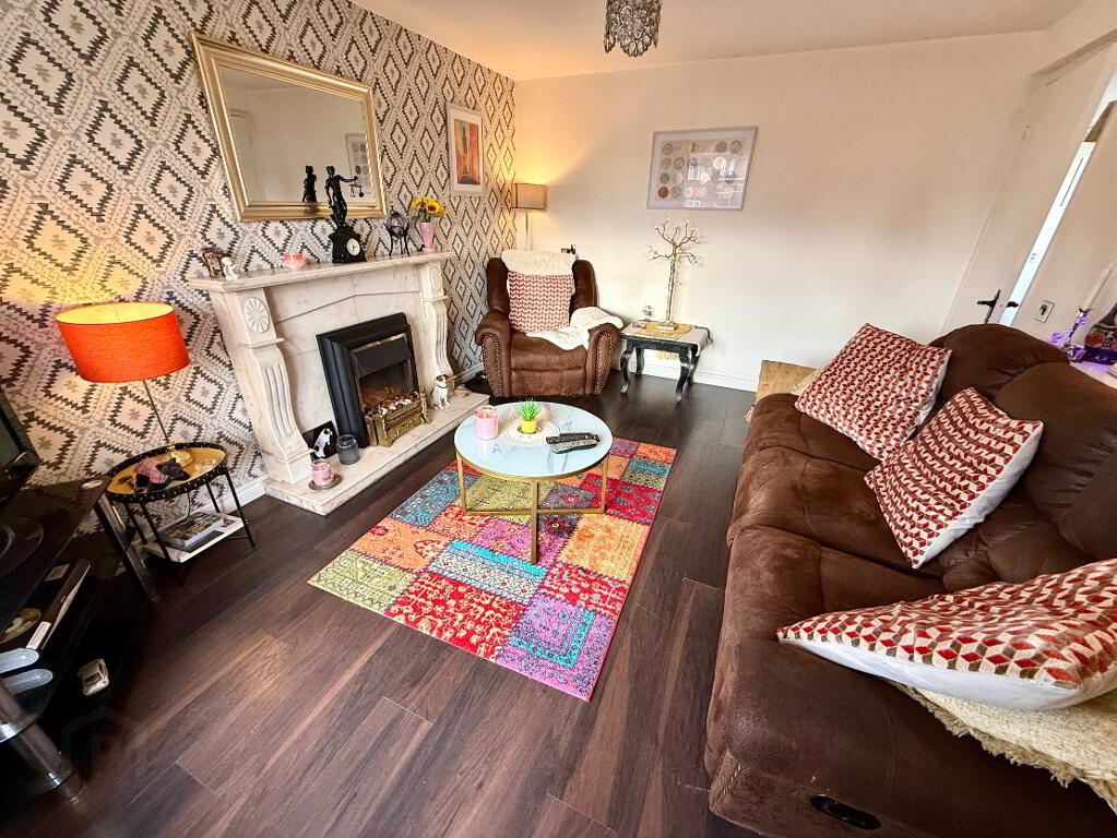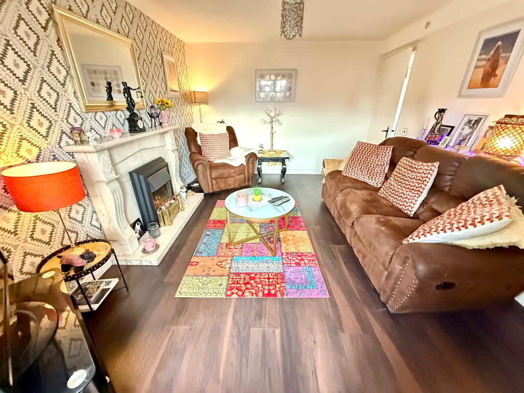 Lounge 13'11 x 11'1 (to widest points) Bow window, imitation marble fireplace and hearth with electric fire, laminated wooden floor.