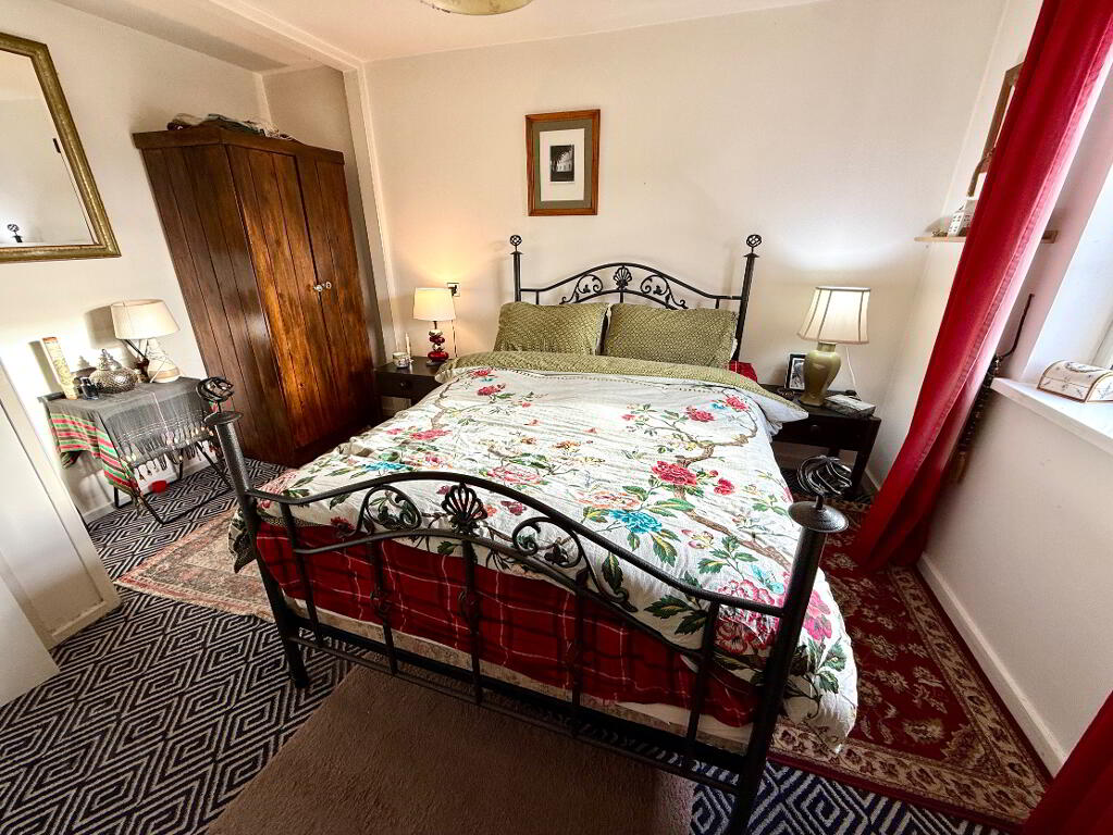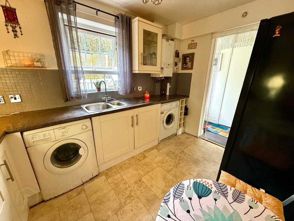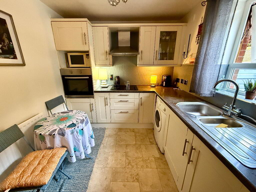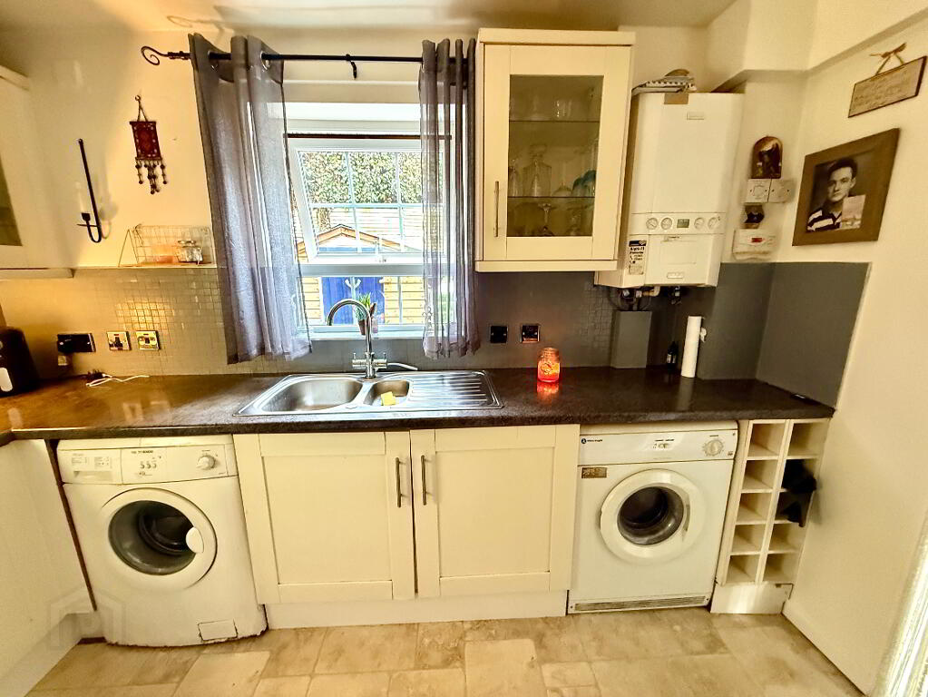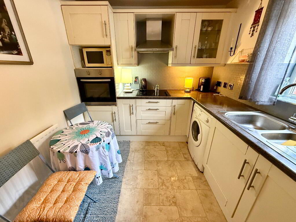 Kitchen 11'1 x 8' Eye and low level units, glazed display units, 1/2 bowl stainless steel sink unit with mixer tap, hob, oven and extractor fan, plumbed for washing machine, space for tumble dryer, wine rack, partly tiled walls.