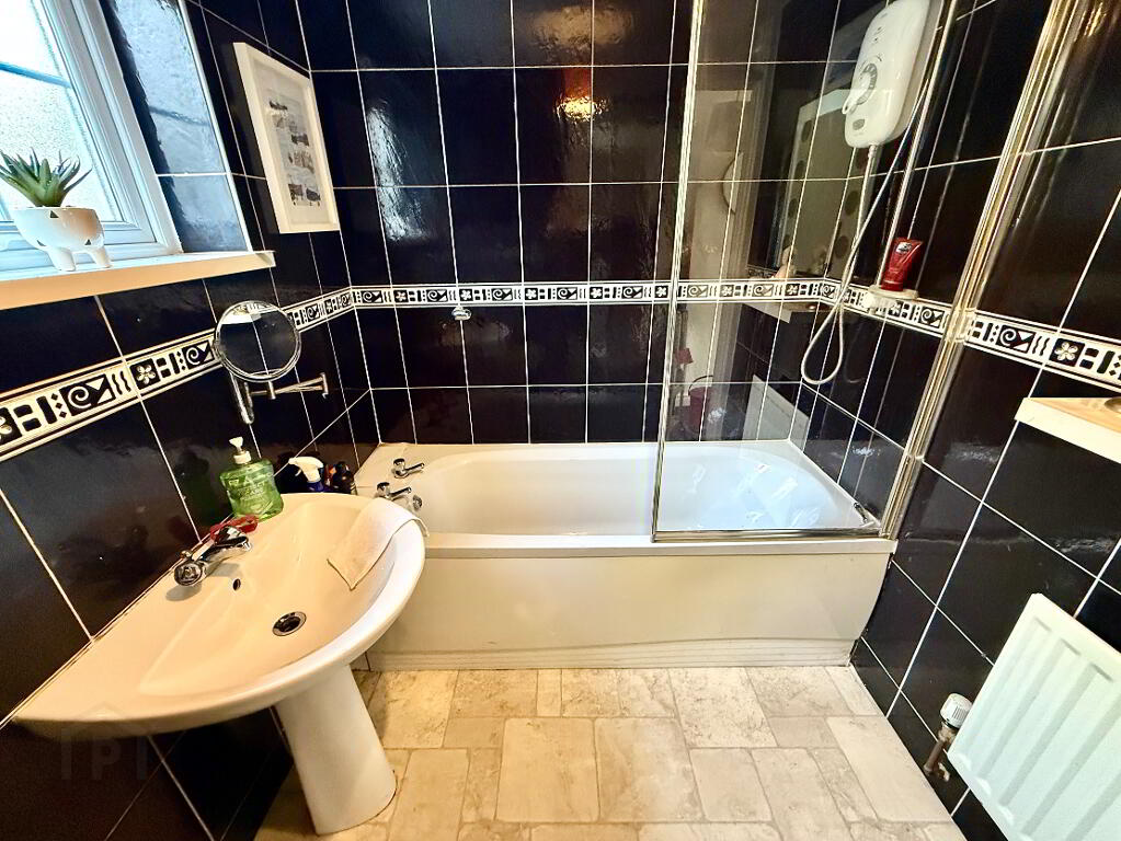 Bathroom Bath with electric shower over head, wash hand basin and WC, fully tiled walls, tiled floor.