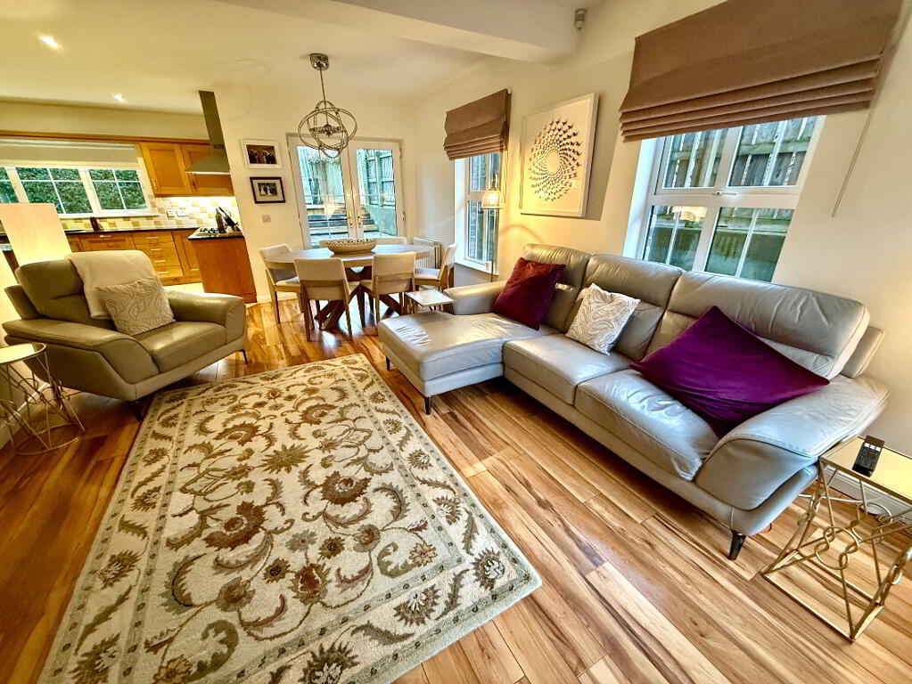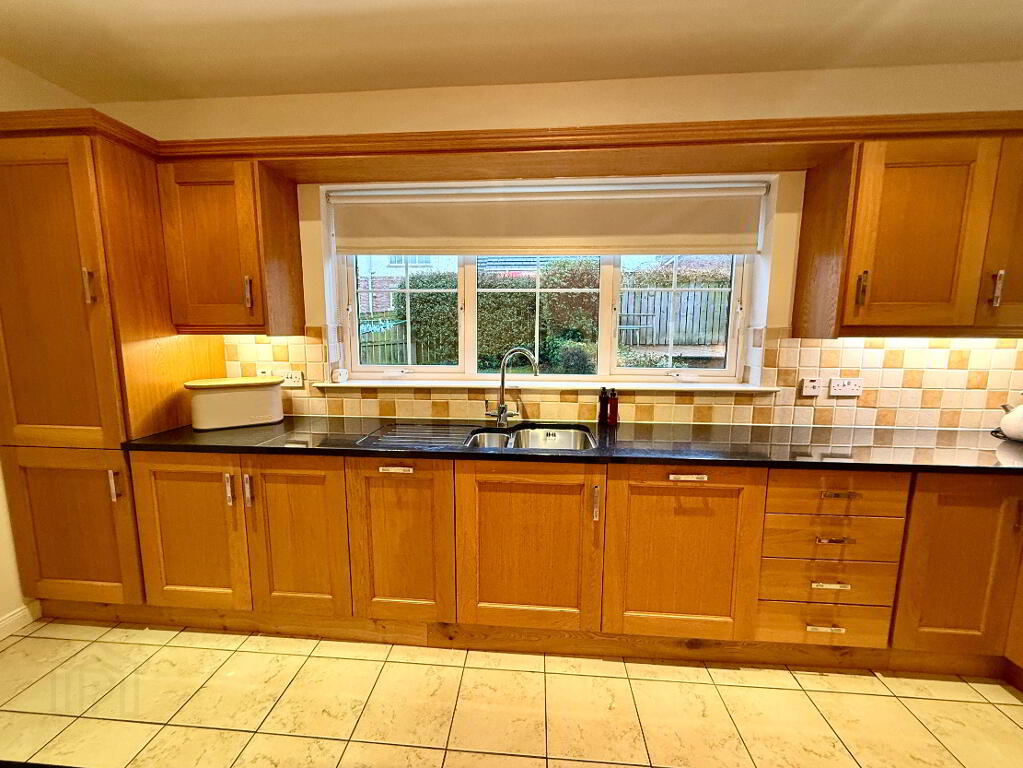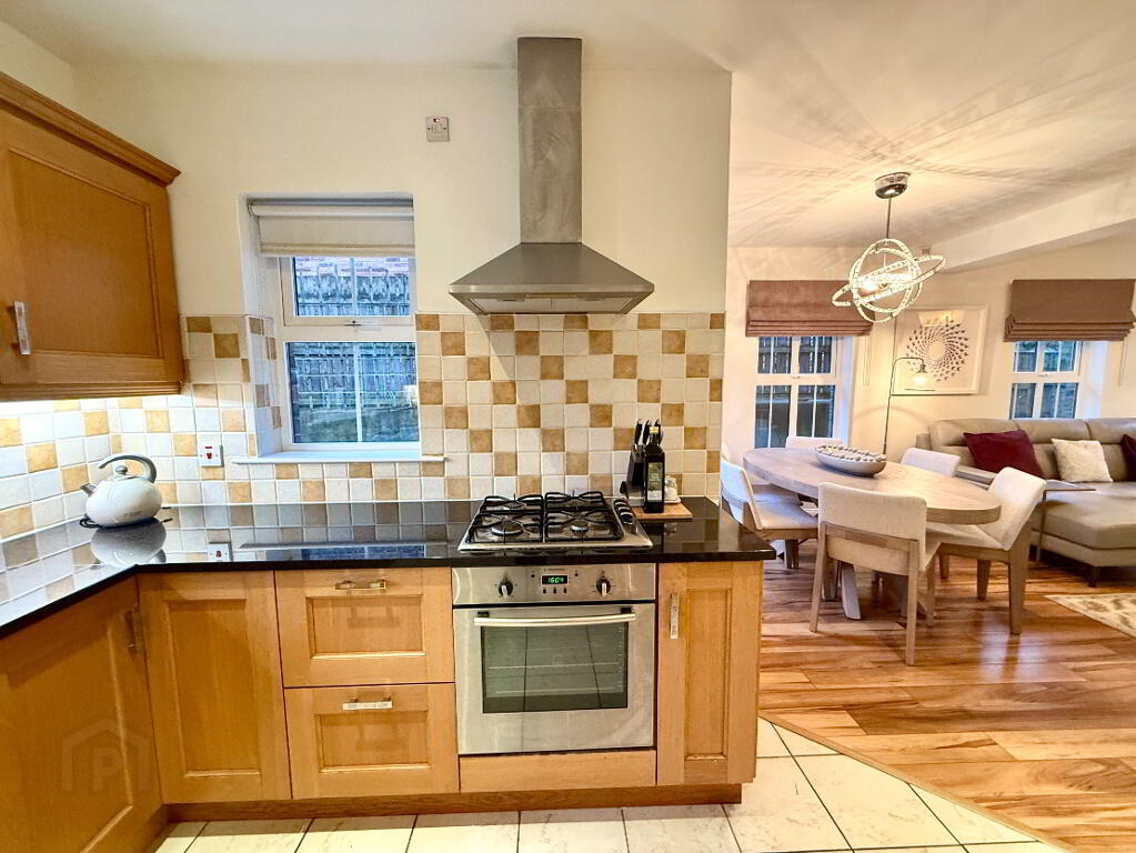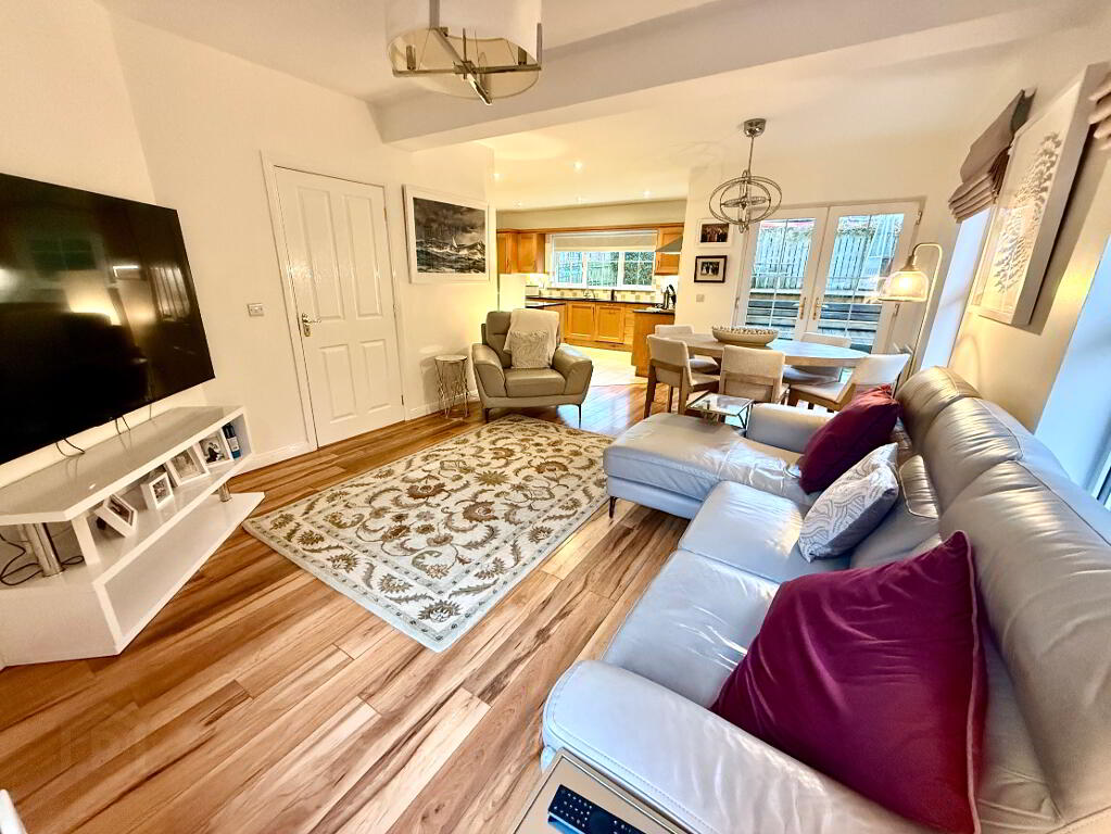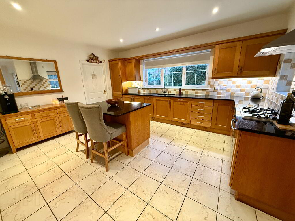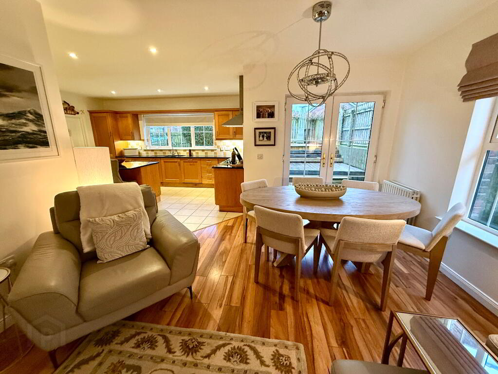 Open Plan Kitchen/Dining/Family Room 27'4 x 23'4 (to widest points) Eye and low level units, 1 1/2 bowl stainless steel sink uniit with mixer tap, hob, oven and extractor fan, plumbed for dishwasher, integrated fridge, centre island with seating, granite worktop, partly tiled walls, tiled floor in kitchen area, laminated wooden floor in family/dining area, double patio doors.