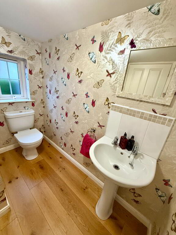 Downstairs WC WC and wash hand basin, partly tiled wall, semi solid wooden floor.
